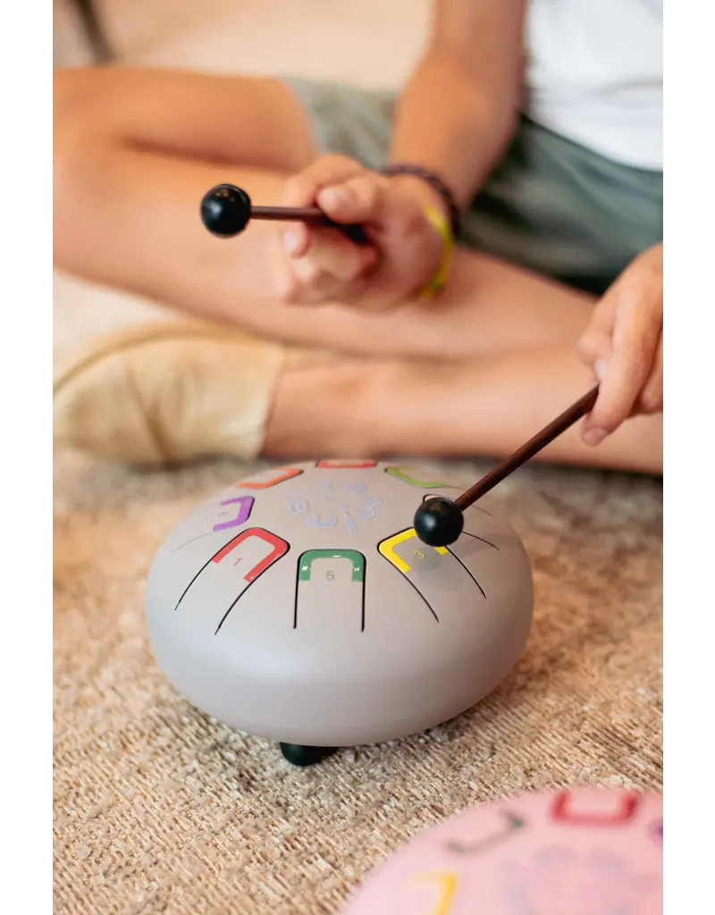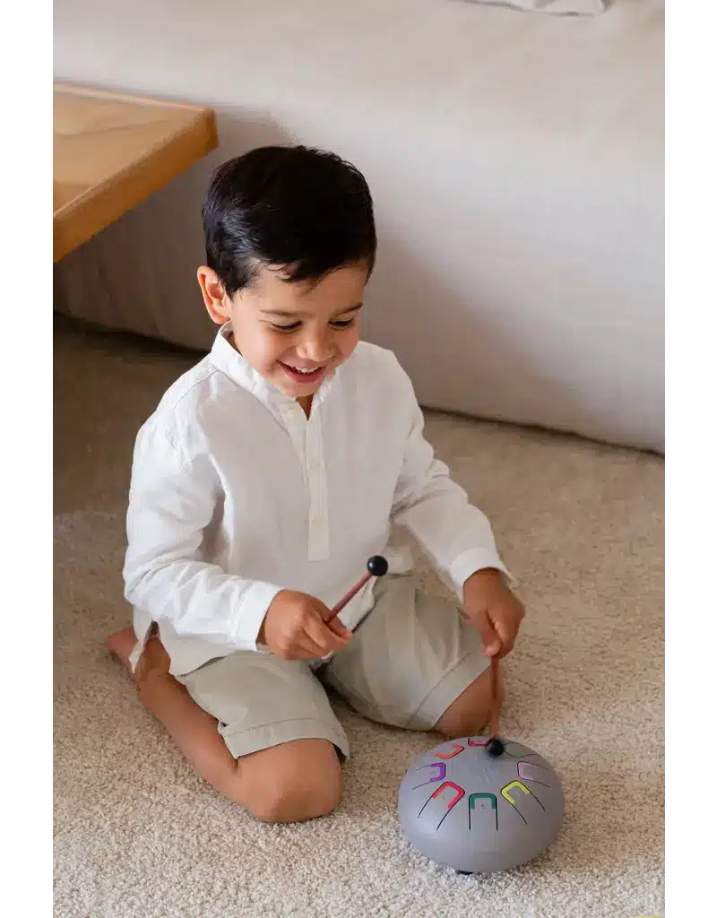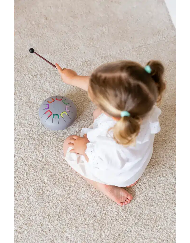 TAMBÚ is een fascinerend muziekinstrument dat ideaal is als introductie tot de wereld van muziek en percussie. Het zendt verschillende tonen uit die met elkaar in verband staan met een harmonieus geluid van lange duur (‘sustain’) en creëert zo een omhullende en zeer ontspannende sfeer. Ook ideaal voor ontspannings- en yogasessies. Naast de mogelijkheid tot vrij spel zijn er op het instrument nummers en kleuren geplakt die passen bij het bijgevoegde kinderliedboek en het gemakkelijker maken om liedjes te begeleiden. – Ø 15 cm – 8 tonen – C majeur
