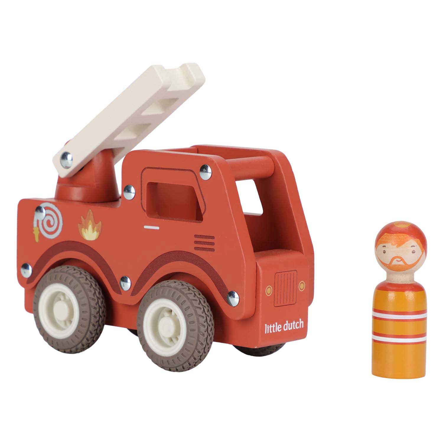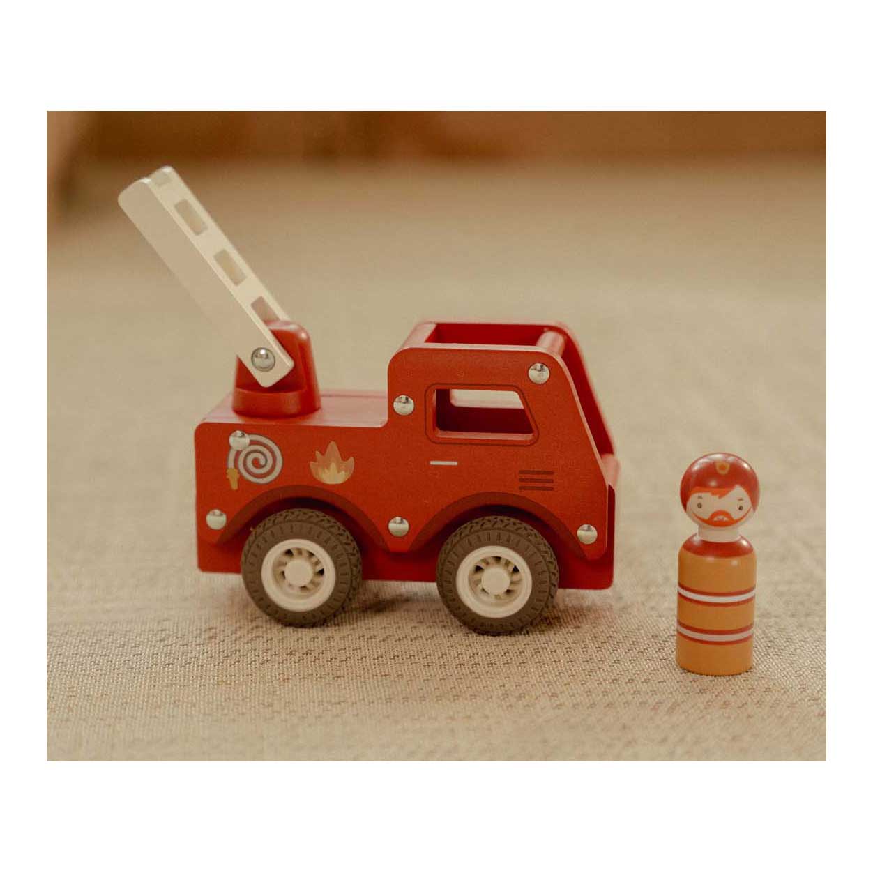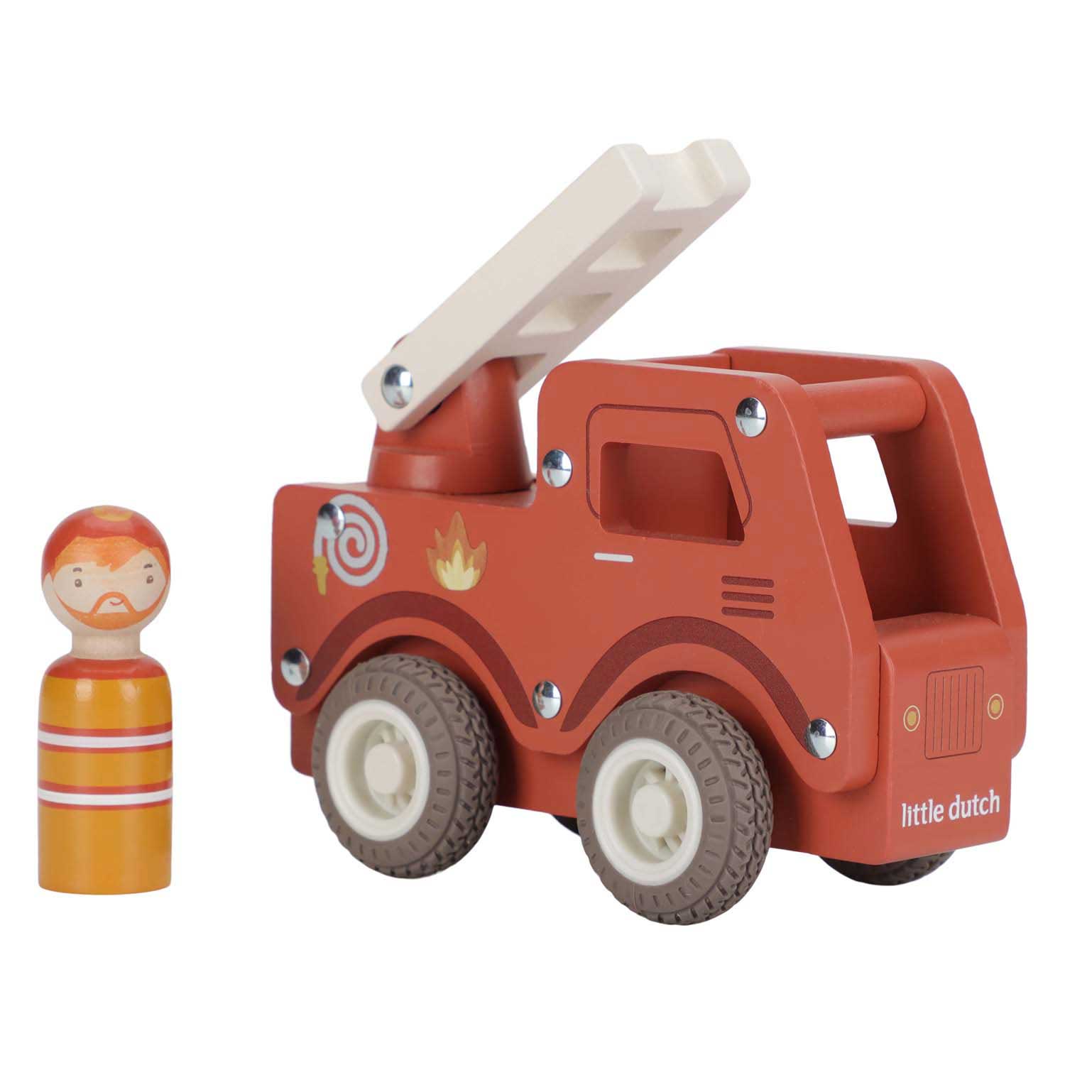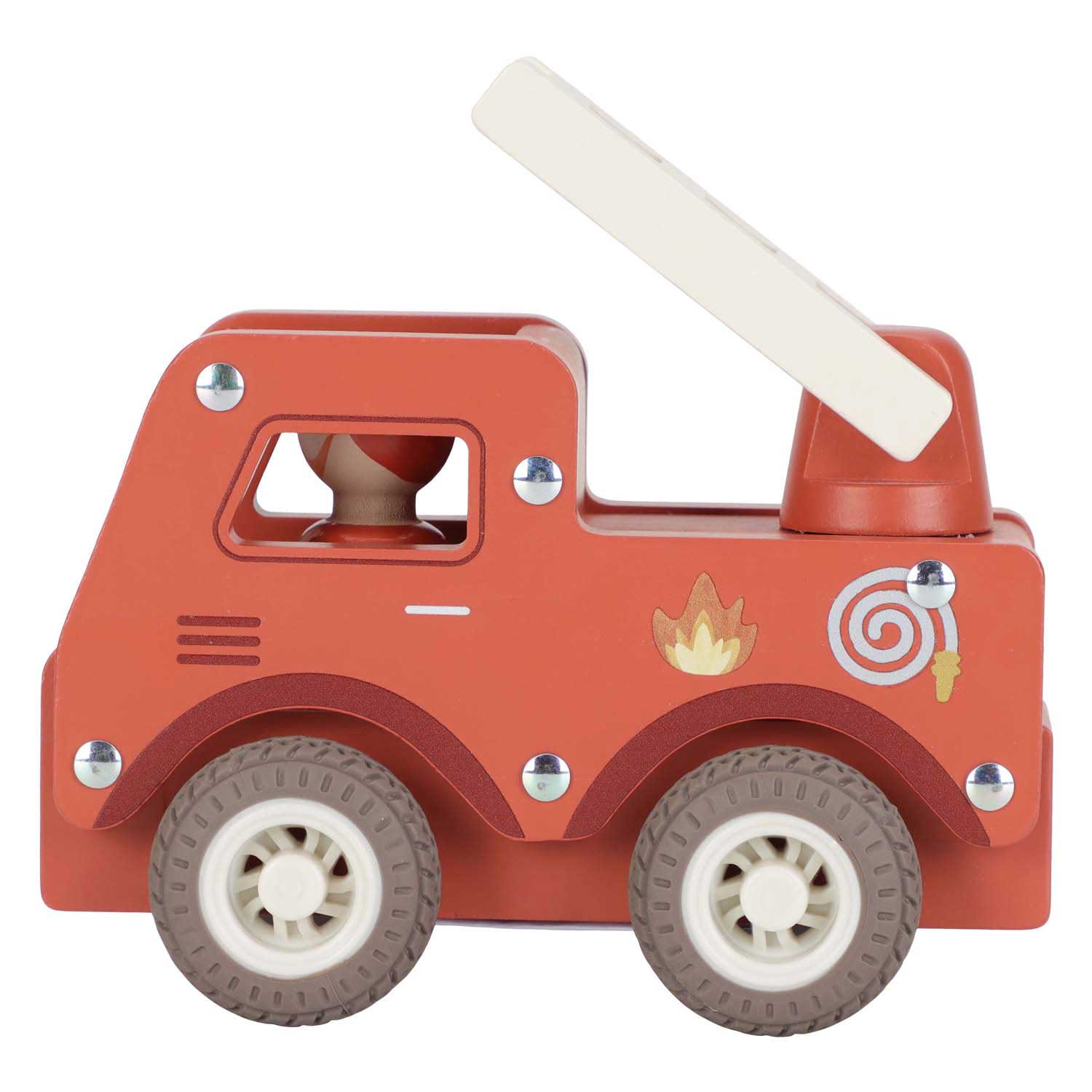 Brandweer klaar! Blus de brand en red de dag met deze stevige houten brandweerwagen. De beweegbare ladder helpt bij elke reddingsmissie, terwijl de rubberen wielen zorgen voor een soepele rit. Help dieren uit hoge bomen en zorg dat iedereen veilig is. De set bevat een dappere brandweerman die altijd klaar staat om te helpen. Perfect om te combineren met de brandweerkazerne voor nog meer actie! .