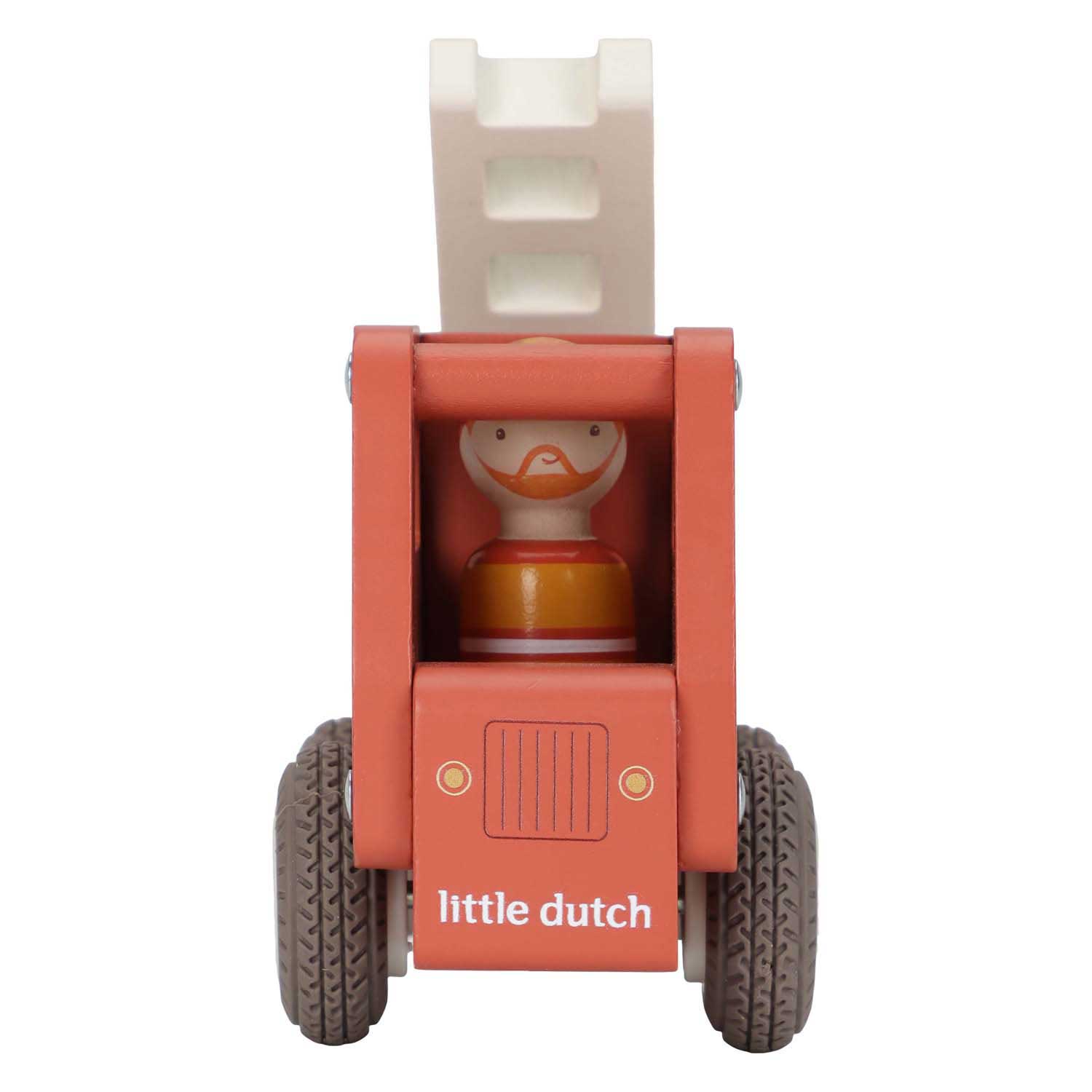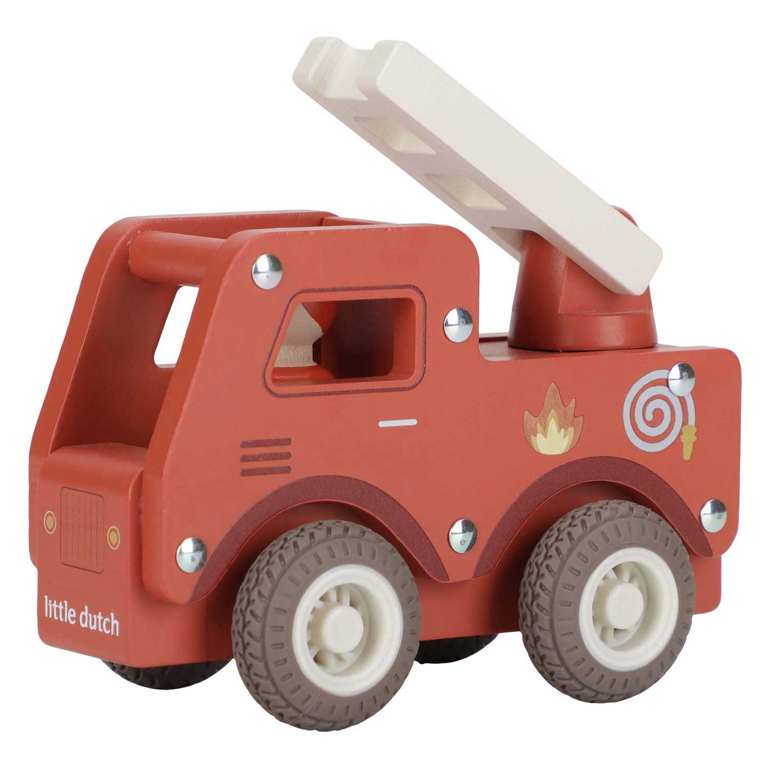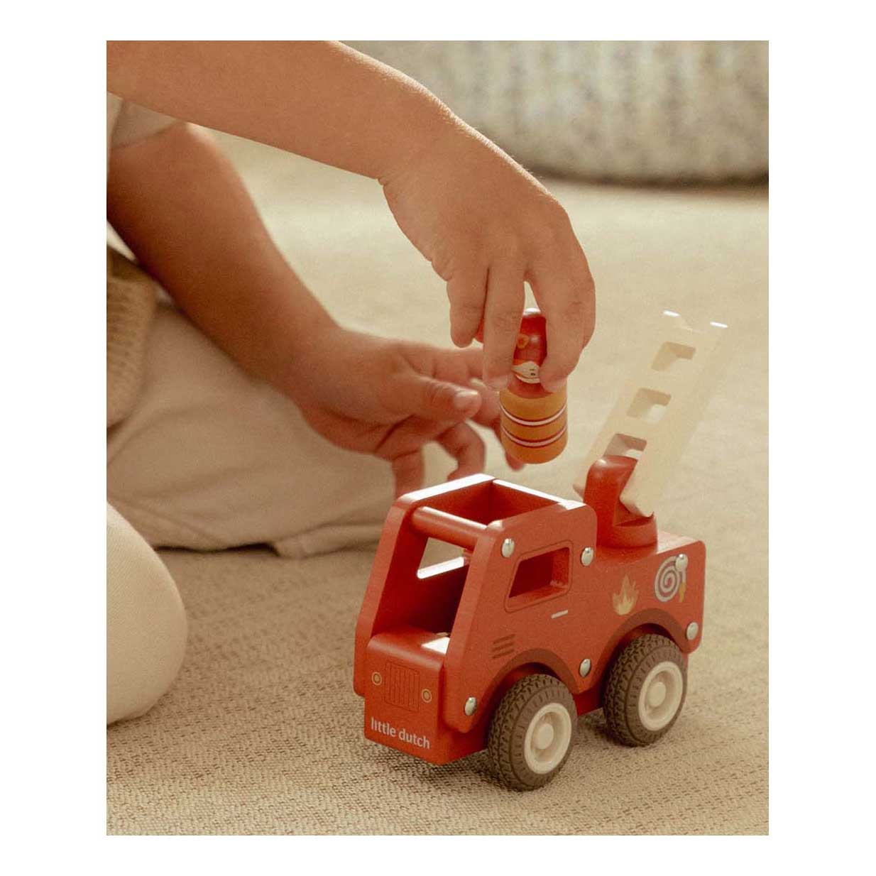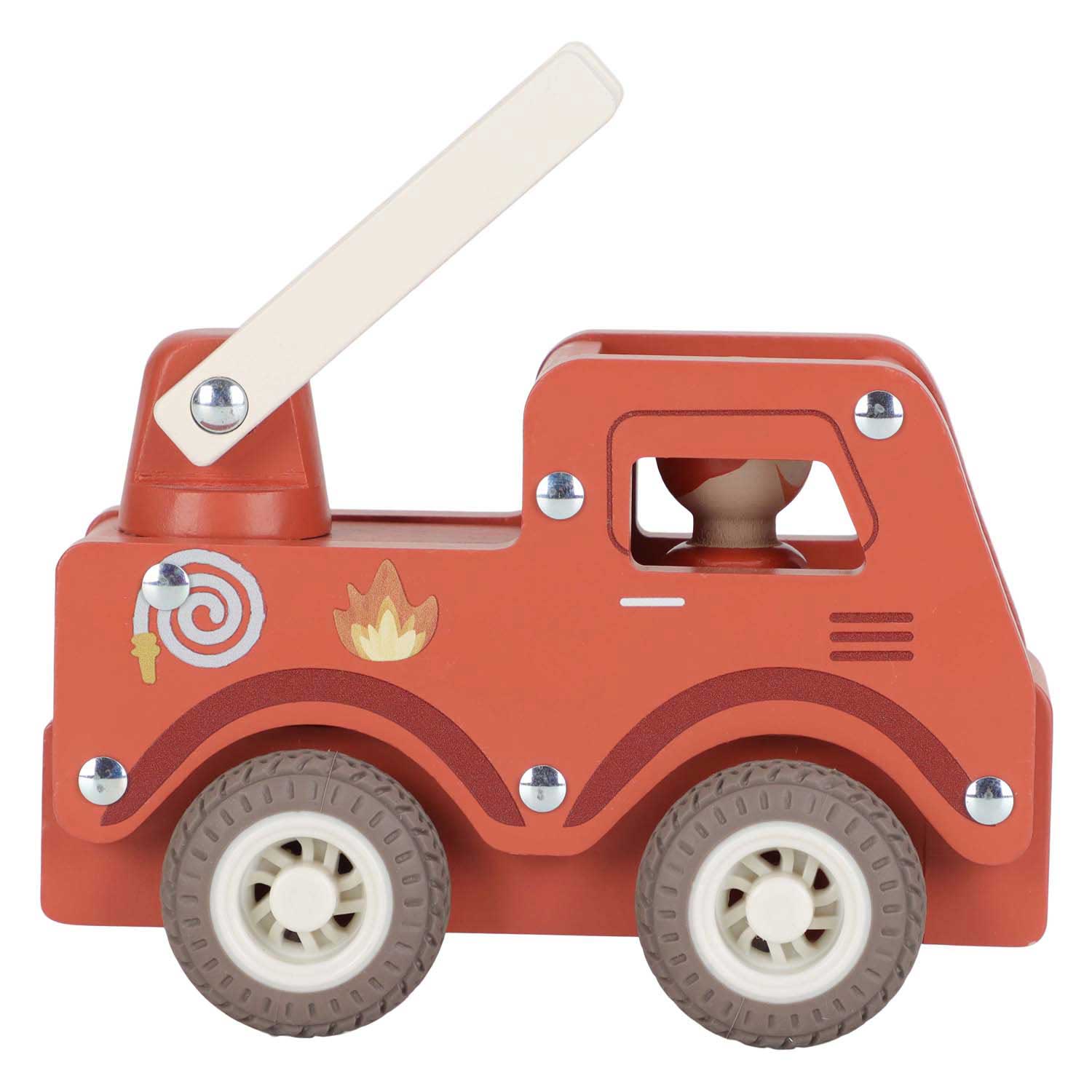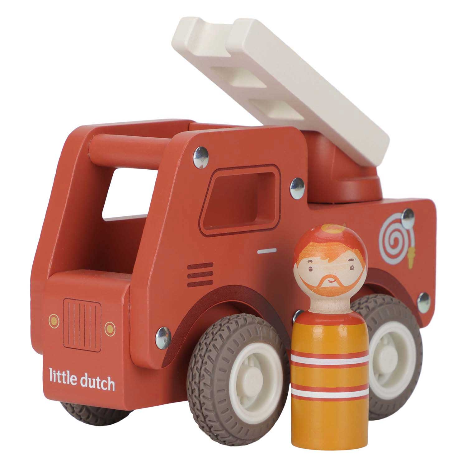 Brandweer klaar! Blus de brand en red de dag met deze stevige houten brandweerwagen. De beweegbare ladder helpt bij elke reddingsmissie, terwijl de rubberen wielen zorgen voor een soepele rit. Help dieren uit hoge bomen en zorg dat iedereen veilig is. De set bevat een dappere brandweerman die altijd klaar staat om te helpen. Perfect om te combineren met de brandweerkazerne voor nog meer actie! .