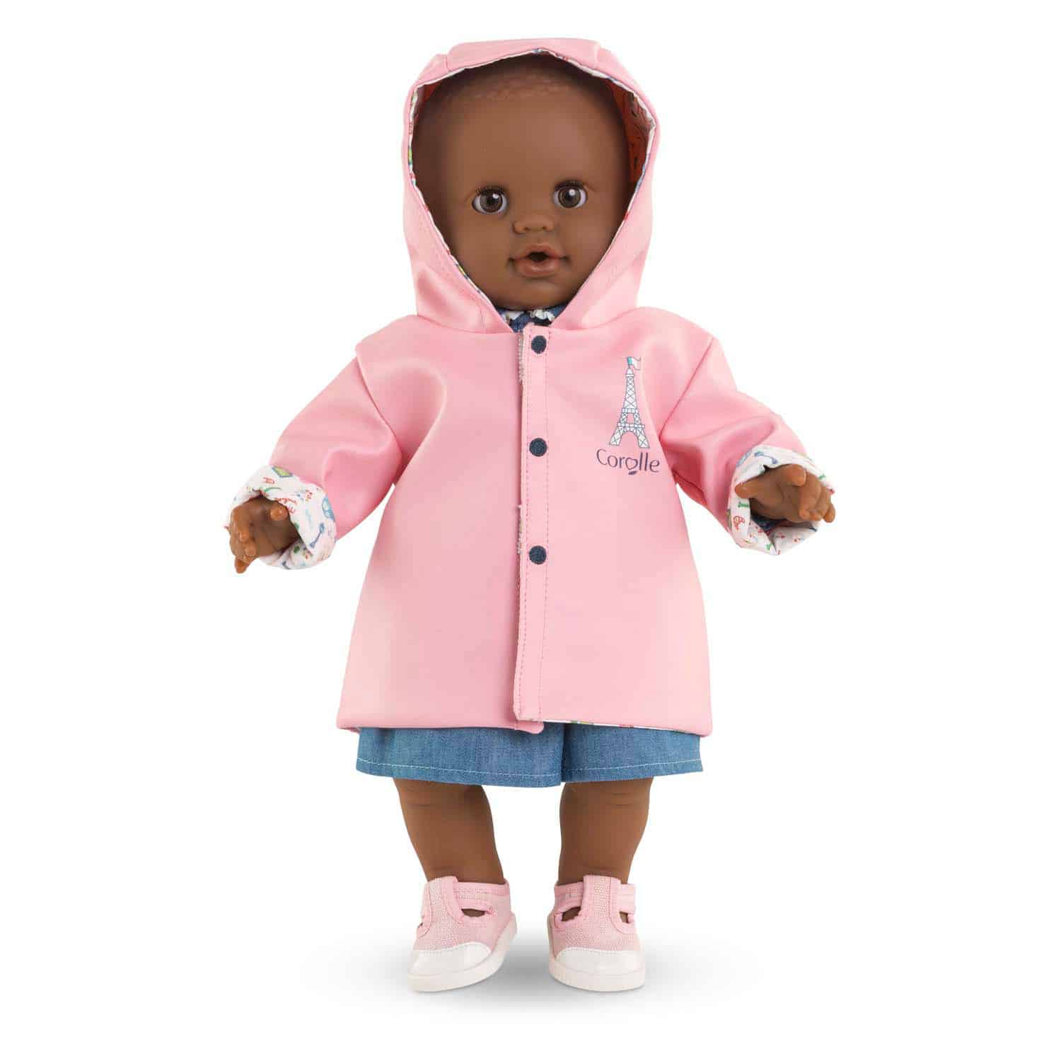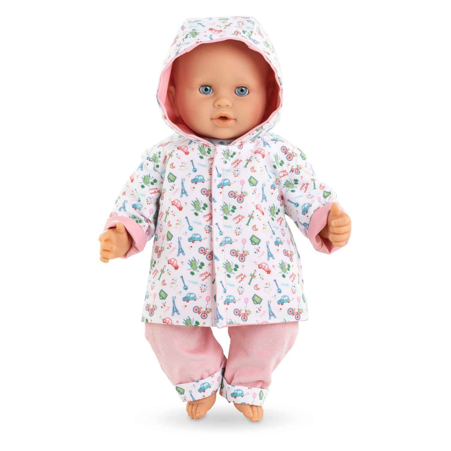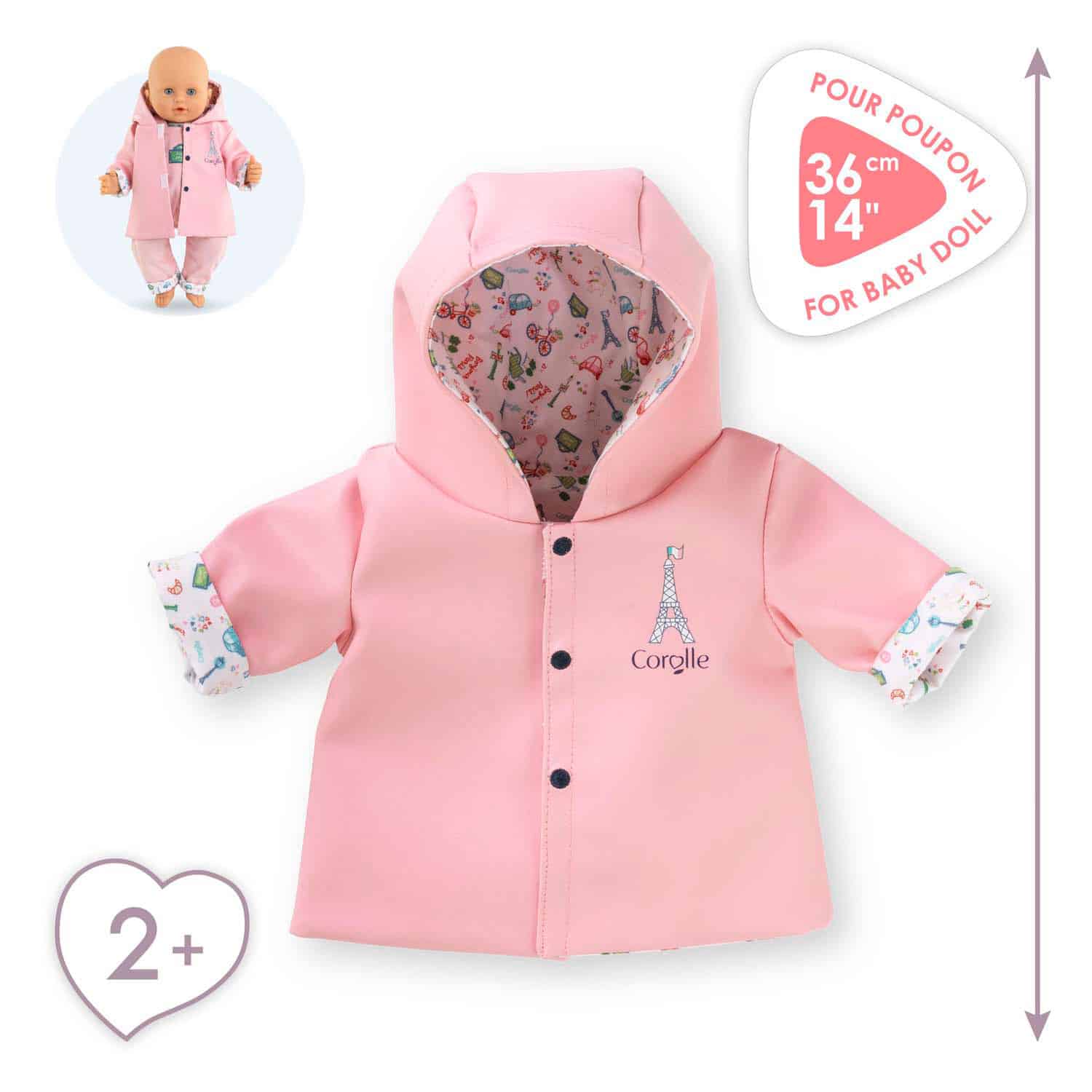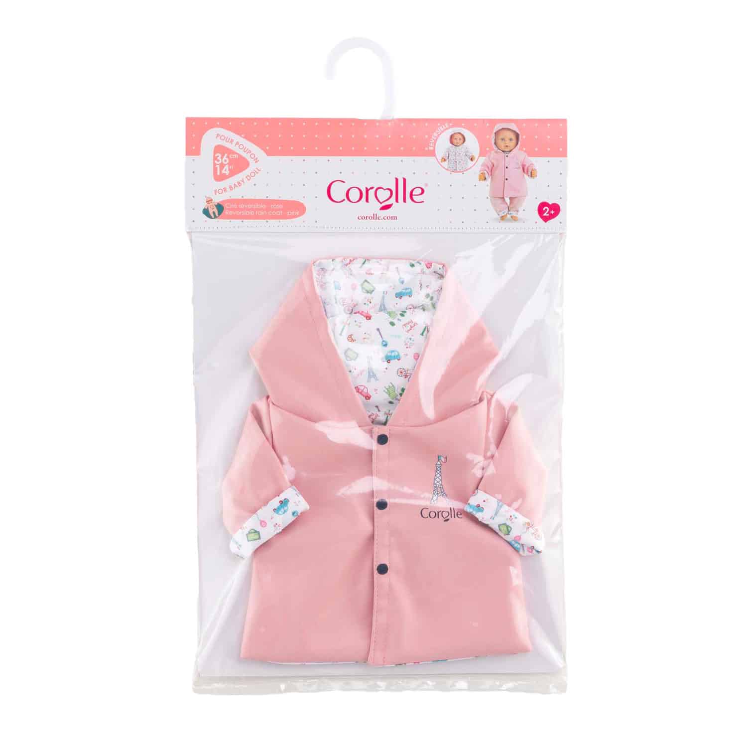 Het regent, het is nat… De Weekend in Parijs omkeerbare regenjas is ideaal om poppen van 36 cm te beschermen tegen slecht weer! De voering van de regenjas is volledig bedekt met de exclusieve stof uit de collectie Week-end à Paris, met talrijke knipogen naar de hoofdstad van Frankrijk. Op de borst is een zeefdruk van de Eiffeltoren te zien, wat een typisch Parijs tintje geeft. De regenjas is volledig omkeerbaar: jouw pop kan kiezen tussen een roze kant met Eiffeltorenprint of een kant met de exclusieve stof uit de Week-end à Paris-collectie. Dit kledingstuk is geschikt voor alle poppen van 36 cm en maakt deel uit van een gevarieerde collectie kledingstukken en accessoires van Corolle.