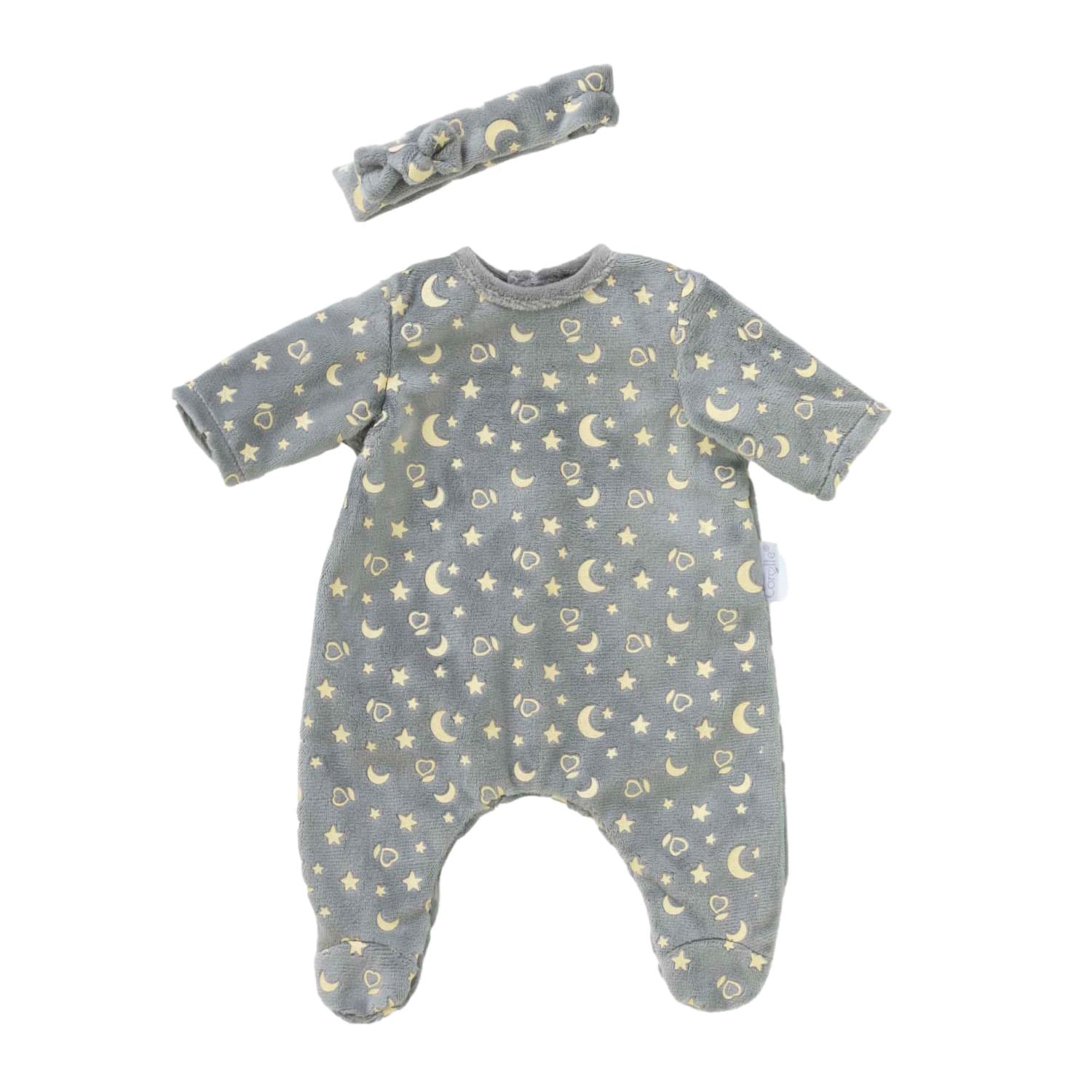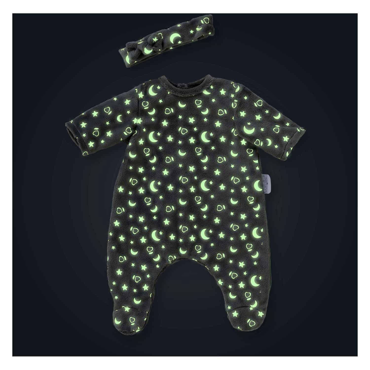Het zandmannetje is gekomen, baby zal de nacht doorbrengen met mooie en zoete dromen! De Shine in the Night pyjama met haarband is het ideale kledingstuk voor kleine Corolle poppen van 30 cm. Deze mooie pyjama is gemaakt van zachte en duurzame materialen. De mooie sterren en manen verlichten deze zachte pyjama wanneer ze geven licht in het donker! Gemakkelijk aan te trekken dankzij de klittenbandsluitingen. Deze outfit is speelgoed dat geschikt is voor kinderen vanaf 18 maanden oud. Pop van 30 cm wordt apart verkocht.