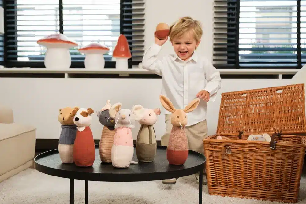 Het kegelspel vrienden is educatief en evolueert mee met de kinderen. De kleintjes vinden de rammelaartjes in de kegels heel leuk en de oudere kinderen testen hun kunsten met de kegels en de bal. Pret verzekerd voor iedereen. Wasbaar in de machine op 30° Bowlingspel Vrienden. 19 cm. Muis, Haas, varken, hond, poes en bal. 6 delig.