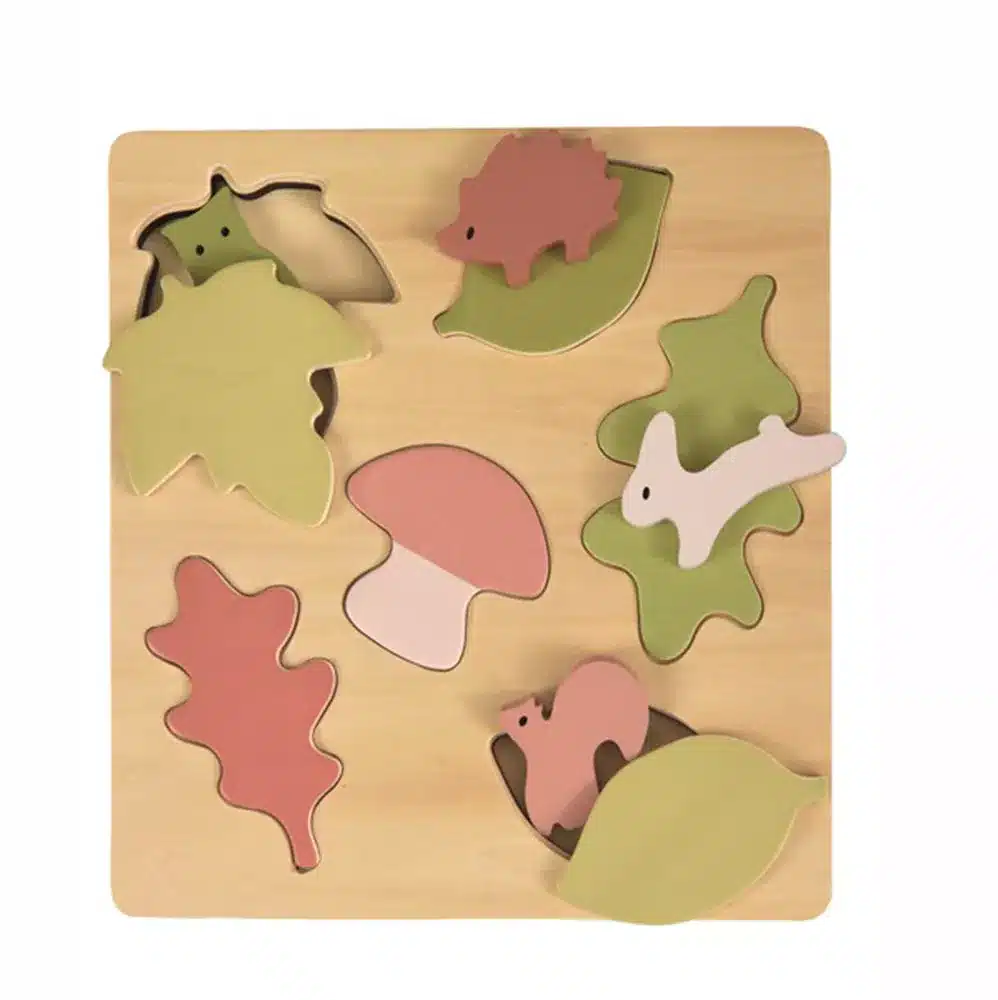 Wat zit er verstopt onder de blaadjes in het bos? Neem een kijkje en ontdek het verborgen leven. Een leuk spel om de mororiek te ontwikkelen. Ecologisch en veilig voor de kleintjes. Kleine vingertjes ontdekken gladde houten vormpjes die perfect op hun plekje passen. Elk stevig stukje kan er gemakkelijk uitgehaald worden dankzij het knopje in de vorm van een vossenkop, waardoor simpel matchen verandert in een heerlijk bosavontuur. 7 prachtig beschilderde bladeren en paddenstoelen helpen bij de ontwikkeling van fijne motoriek en vormherkenning. Perfect cadeau voor nieuwsgierige kleine ontdekkers.