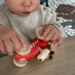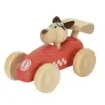 Duw deze soepele rode racewagen over de vloer en kijk hoe de houten wielen vrij ronddraaien. De gesneden hondencoureur met zijn kleine brilletje is klaar voor een avontuur rond de keukentafel of door de gang. Kleine handjes ontwikkelen coördinatie door te spelen en genieten tegelijkertijd van de robuuste, geschuurde houten constructie. Elk detail is met de hand afgewerkt met kindvriendelijke verf, waardoor het speelgoed talloze racesessies kan doorstaan. Een tijdloos speeltje dat een dierbaar aandenken wordt op de plank in de slaapkamer. Perfect cadeau voor beginnende racefanaten.