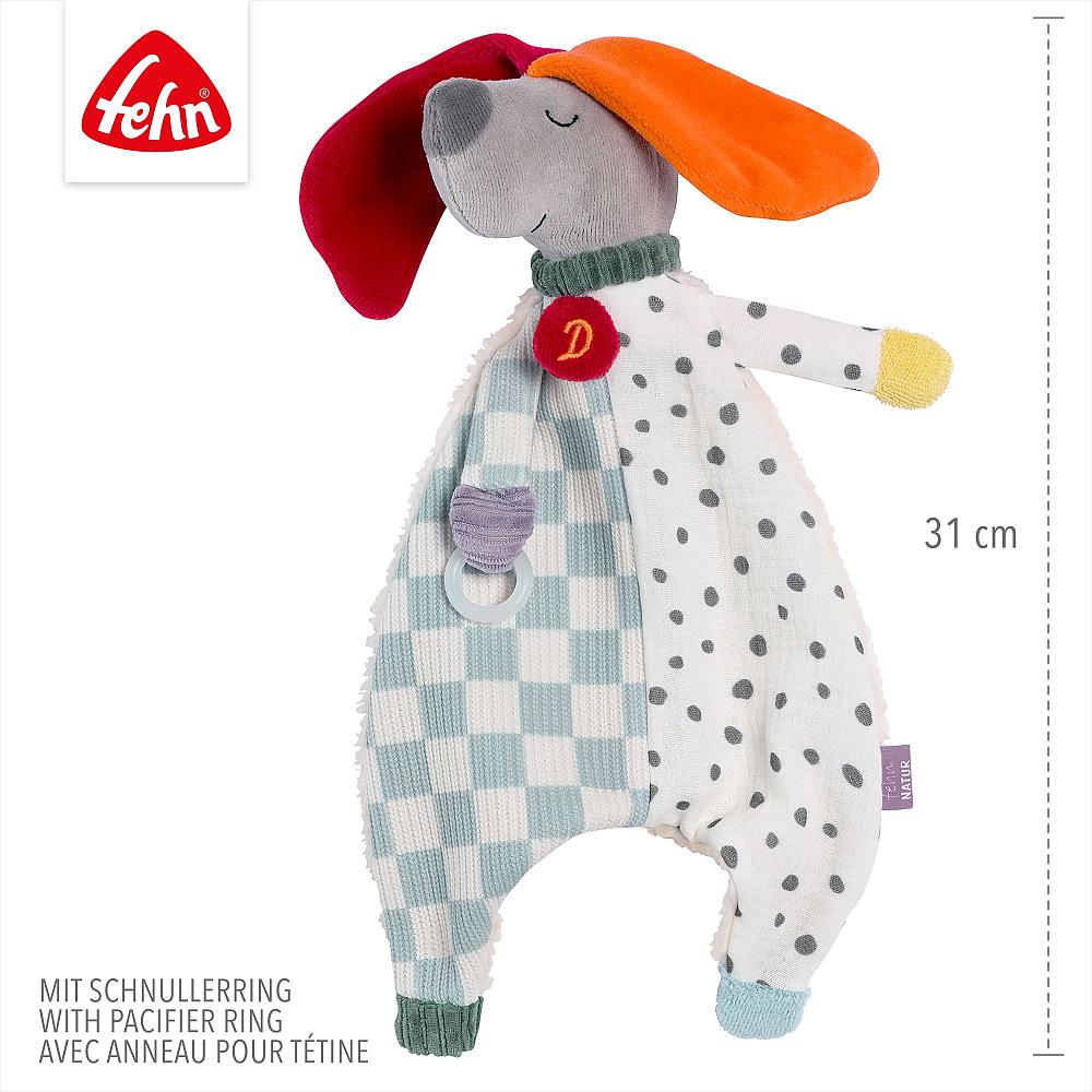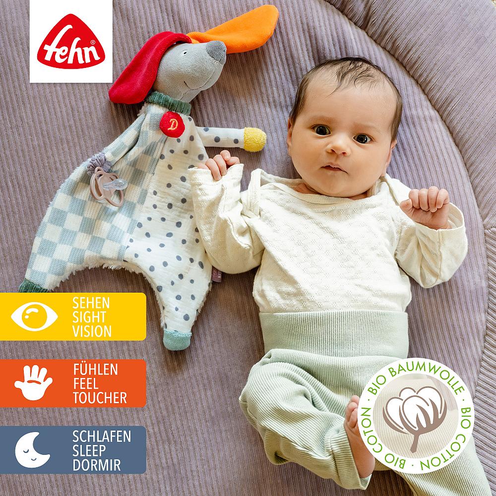 Speelkameraadje en knuffel van biologisch katoen met speenopzetstuk voor baby’s en peuters vanaf 0 maanden. EEN TROUWE METGEZEL – De knuffelzachte hondenknuffel tovert een lach op het gezichtje van baby’s: hij biedt troost, warmte en een gevoel van veiligheid en wordt al snel een beste vriend. Deze schattige deken is een echte hulp bij het in slaap vallen, hij nestelt zich gemakkelijk in het hart van vermoeide avonturiers en wordt een trouwe metgezel, zowel thuis als op reis. Alle gangbare fopspenen met of zonder handvat kunnen eenvoudig aan de bevestigingsring van de knuffeldeken worden bevestigd, de mix van materialen nodigt uit tot grijpen, voelen en knuffelen.