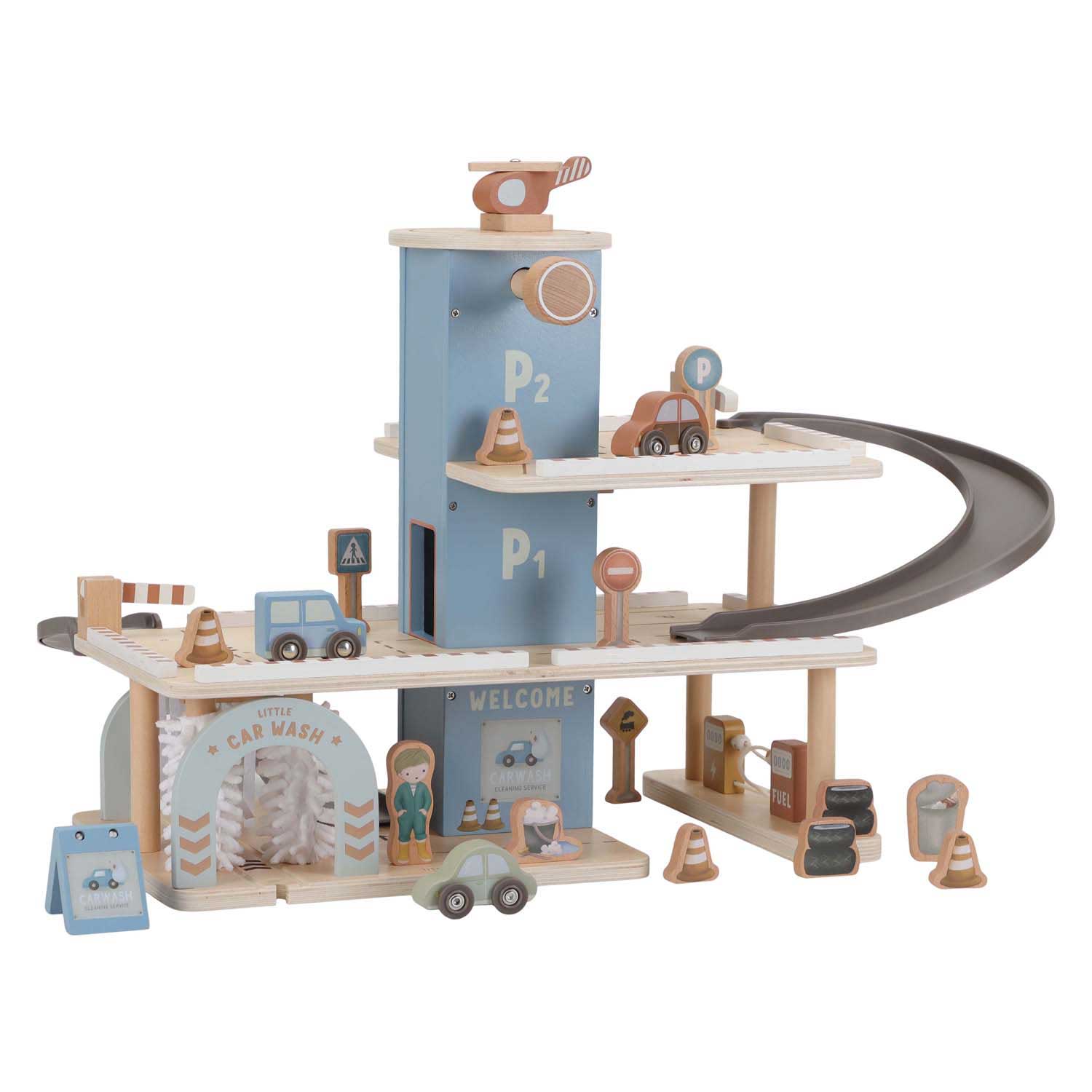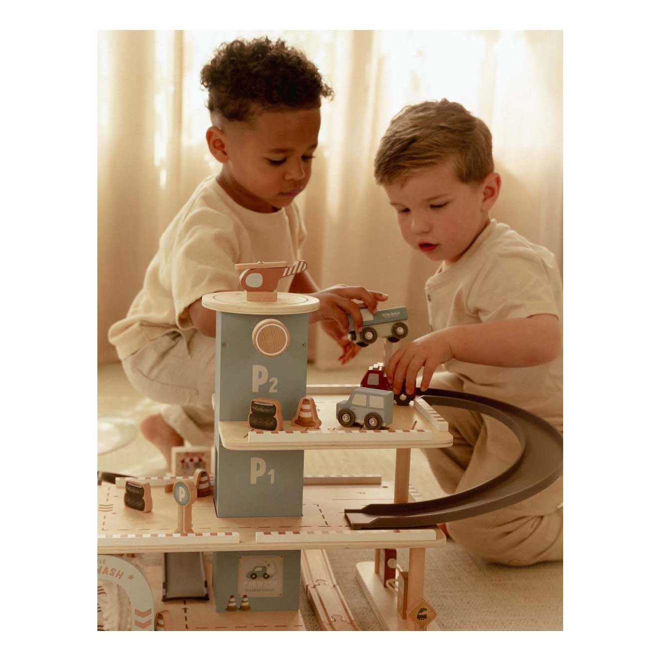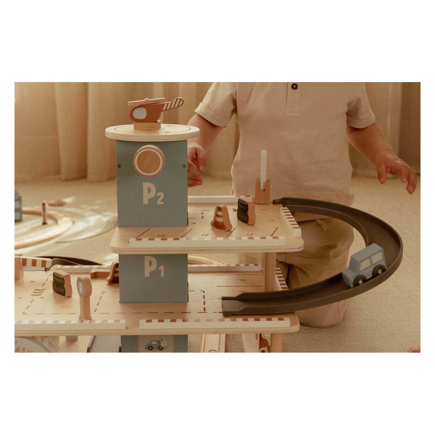Parkeer, tank en race! Deze houten speelgoedgarage is een geweldige aanvulling op de Little Dutch Treinbaan XL. Op de begane grond vind je een carwash, daarboven twee parkeerdekken, een elektrisch oplaadstation en zelfs een helikopterplatform. De set bevat houten accessoires zoals verkeersborden, stapelbanden en een emmer, plus drie voertuigen en een helikopter. Rijd omhoog, parkeer je auto of vlieg met de helikopter naar je bestemming: het kan allemaal. Eindeloos speelplezier gegarandeerd! .