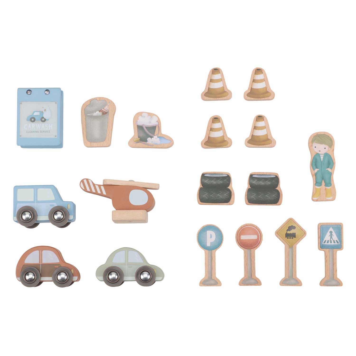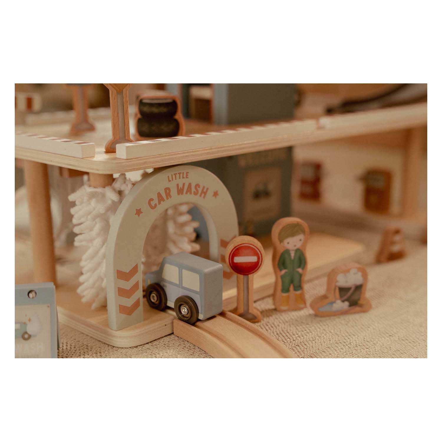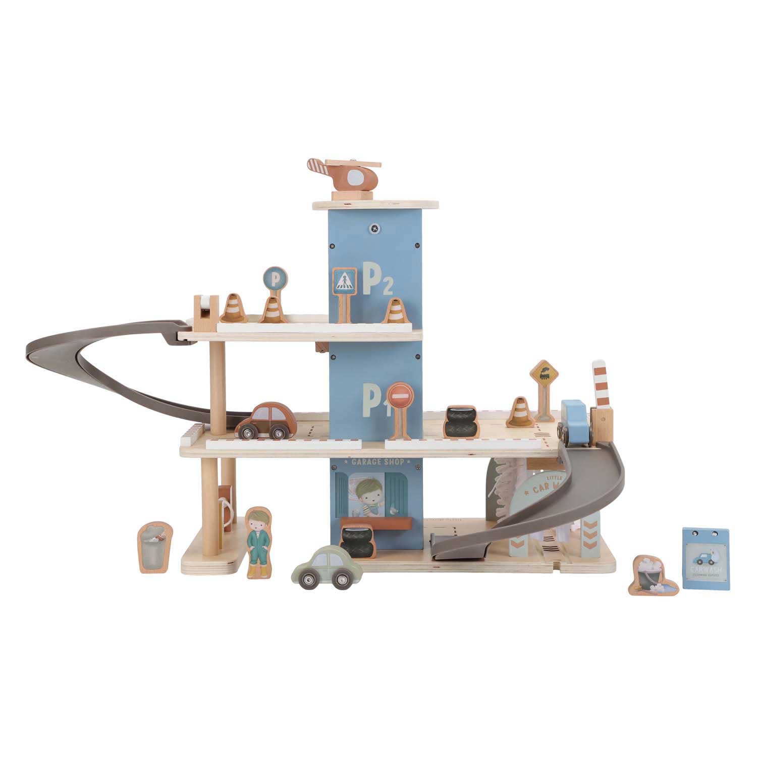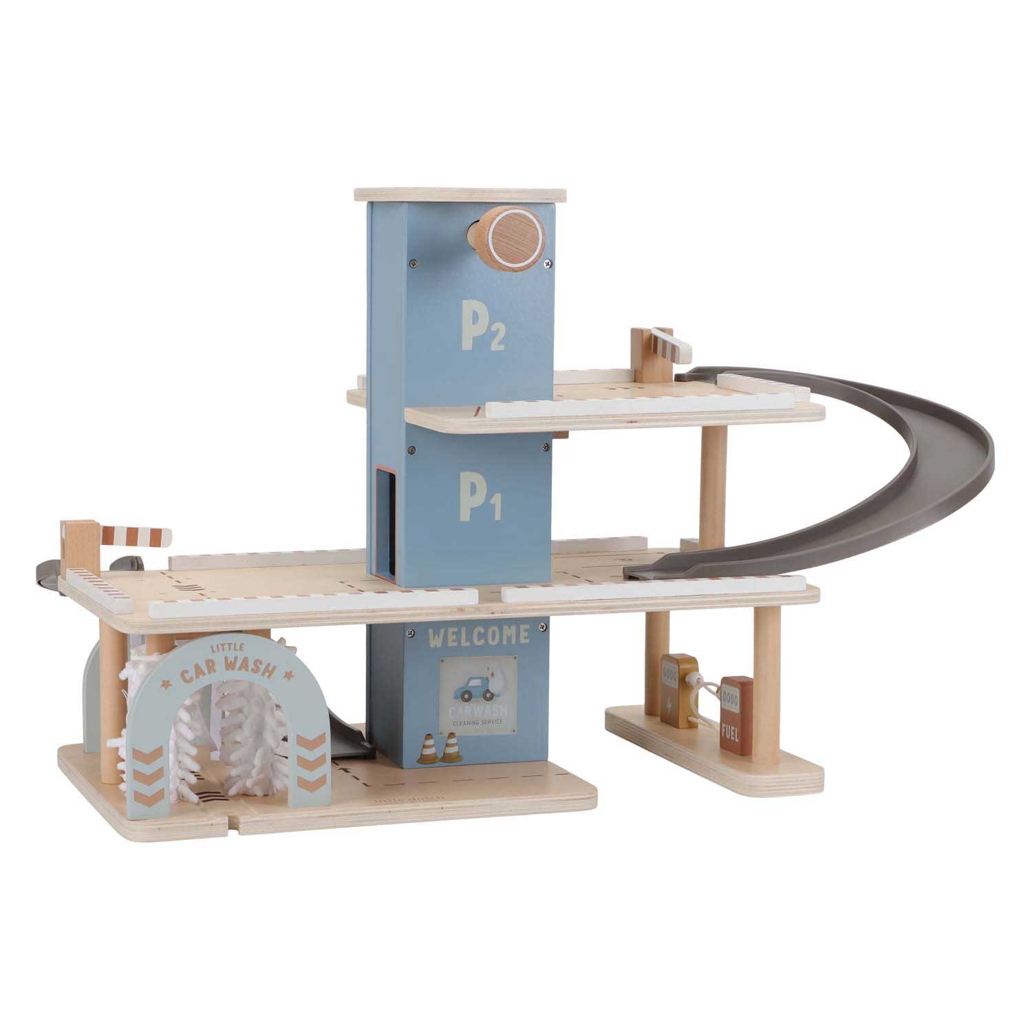 Parkeer, tank en race! Deze houten speelgoedgarage is een geweldige aanvulling op de Little Dutch Treinbaan XL. Op de begane grond vind je een carwash, daarboven twee parkeerdekken, een elektrisch oplaadstation en zelfs een helikopterplatform. De set bevat houten accessoires zoals verkeersborden, stapelbanden en een emmer, plus drie voertuigen en een helikopter. Rijd omhoog, parkeer je auto of vlieg met de helikopter naar je bestemming: het kan allemaal. Eindeloos speelplezier gegarandeerd! .