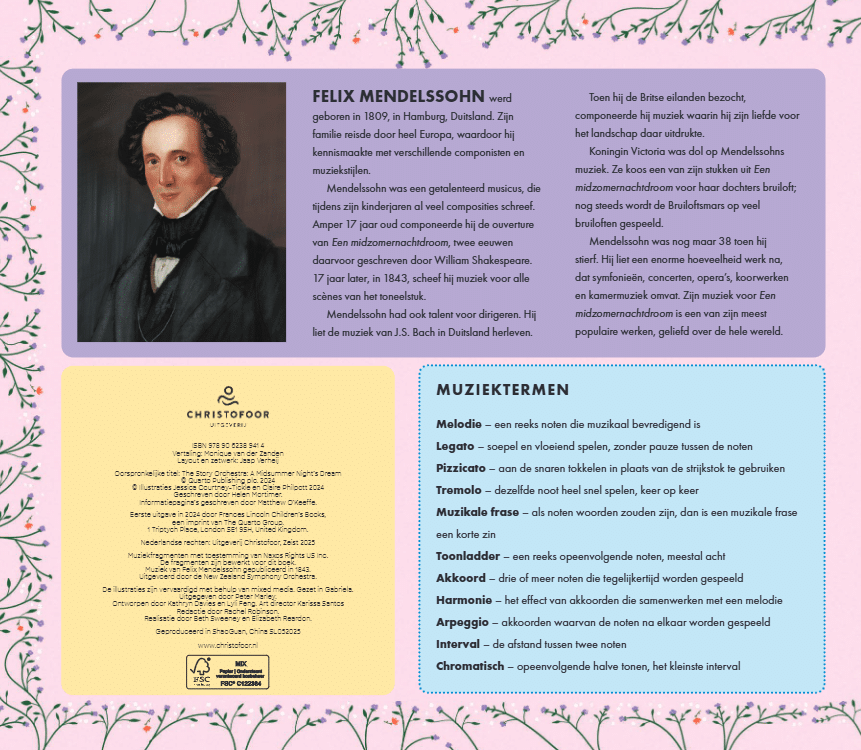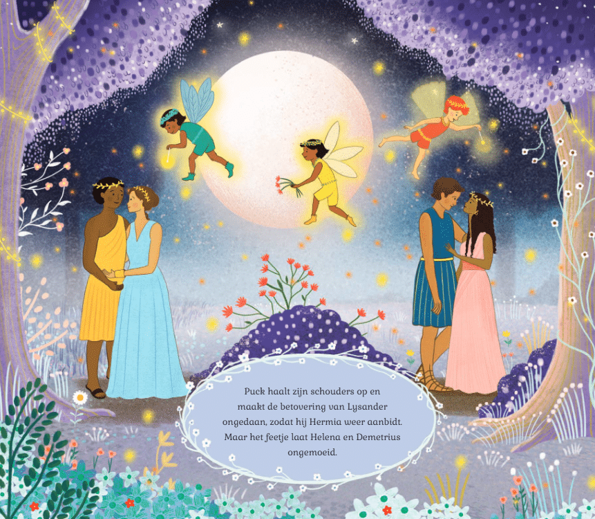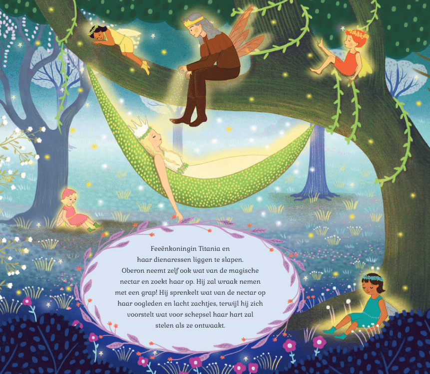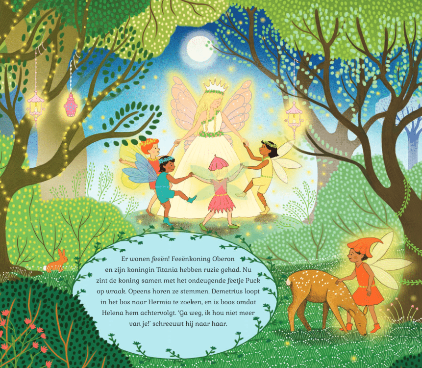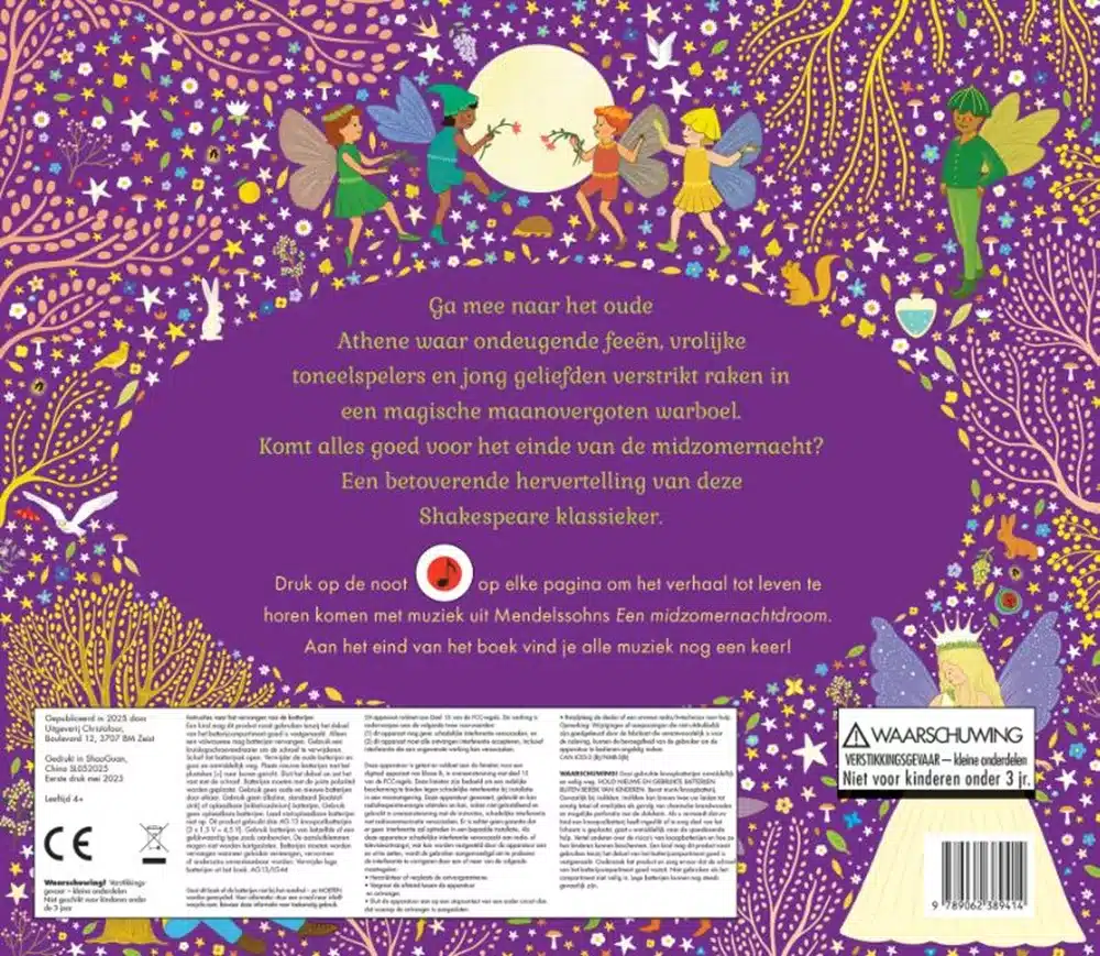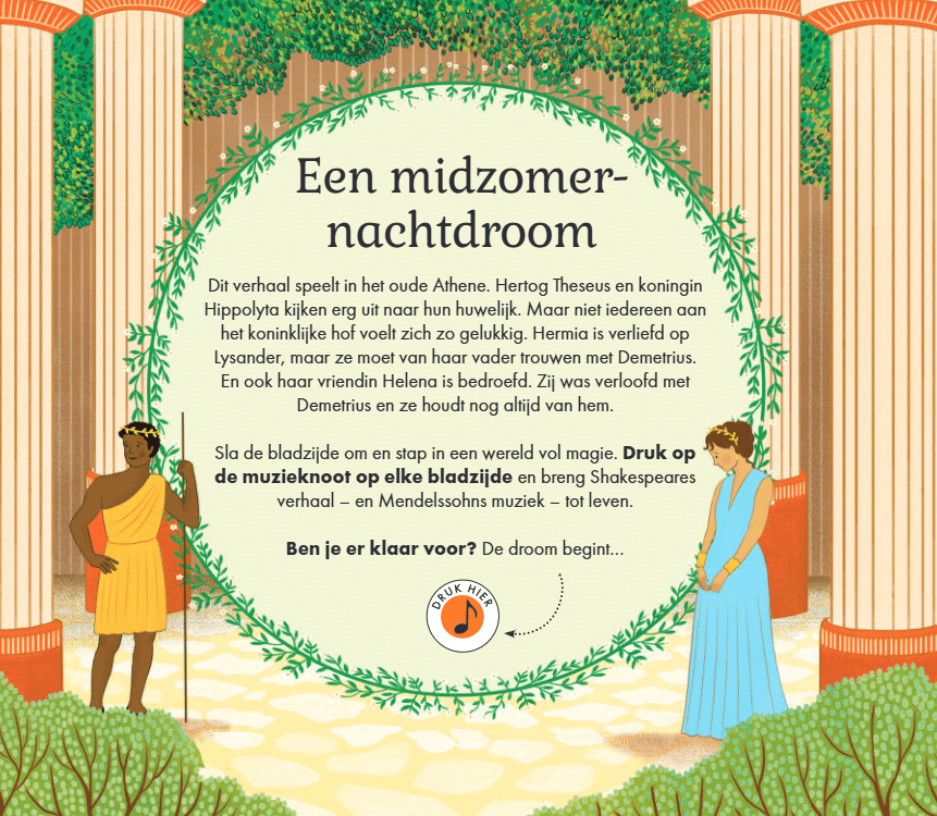 Een betoverende hervertelling van de Shakespeare klassieker als muzikaal prentenboek. Druk op de noot en luister naar de prachtige muziekfragmenten van Mendelssohn. Ga mee naar het oude Athene waar ondeugende feeën, vrolijke toneelspelers en jonggeliefden verstrikt raken in een maanovergoten warboel. Komt alles goed voor het einde van de midzomernacht?