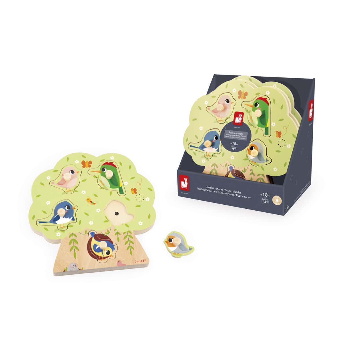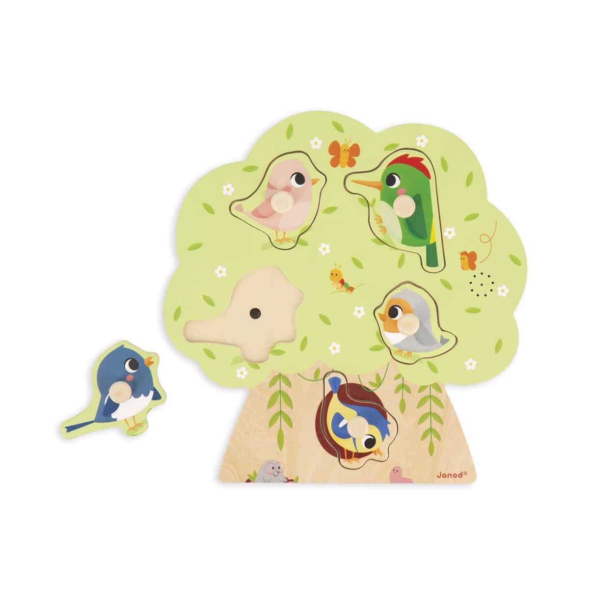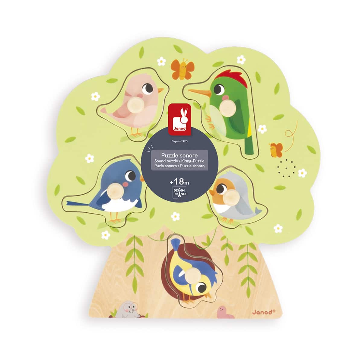 Een puzzel om mee te spelen… en naar te luisteren! Deze houten geluidspuzzel in de vorm van een boom is geschikt voor baby’s vanaf 18 maanden. Deze puzzel bestaat uit 5 stukjes en is speciaal ontworpen voor nieuwsgierige kleine handjes. De stukjes hebben afgeronde hoeken en houten pinnen zodat ze gemakkelijk vast te pakken zijn. Dit houten geluidsspeelgoed is ideaal om baby’s vanaf zeer jonge leeftijd te helpen bij de ontwikkeling van hun gehoor, fijne motoriek en logica! Zodra een puzzelstukje op de juiste plaats ligt, druk je er gewoon op om een vogelgeluid te activeren: tortelduif, gaai, roodborstje, mees en groene specht. Op dit speelgoed vinden baby’s 5 schattige vogeltjes, maar ook vlinders, een rups, een regenworm… en zelfs een mol!