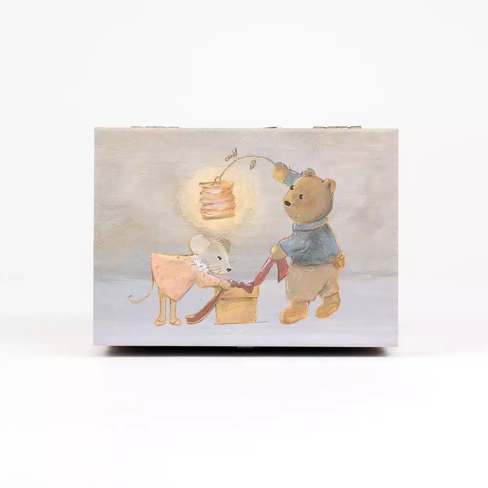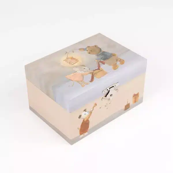 Het perfecte cadeau deze muziekdoos Vrienden. Aan de achterzijde opwinden en als je het doosje opent, begint de muziek te spelen en draait het schattige beertje. Ideaal om je juweeltjes op te bergen. Melodie: Moonlight Sonata.
