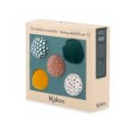 Deze Set van 5 flexibele en lichte zintuiglijke ballen, die met stof zijn bekleed, is ideaal om de baby op een leuke manier te stimuleren. – Ontwikkelt de fijne motoriek en het gezichtsvermogen – Stoffen in verschillende materialen om de baby met meerdere tastbare sensaties vertrouwd te maken – Contrasterende kleuren en opdruk, geschikt voor het gezichtsvermogen van de baby. Kan in de wasmachine op 30 graden gewassen worden. Doorsnede balletje: 5 cm.