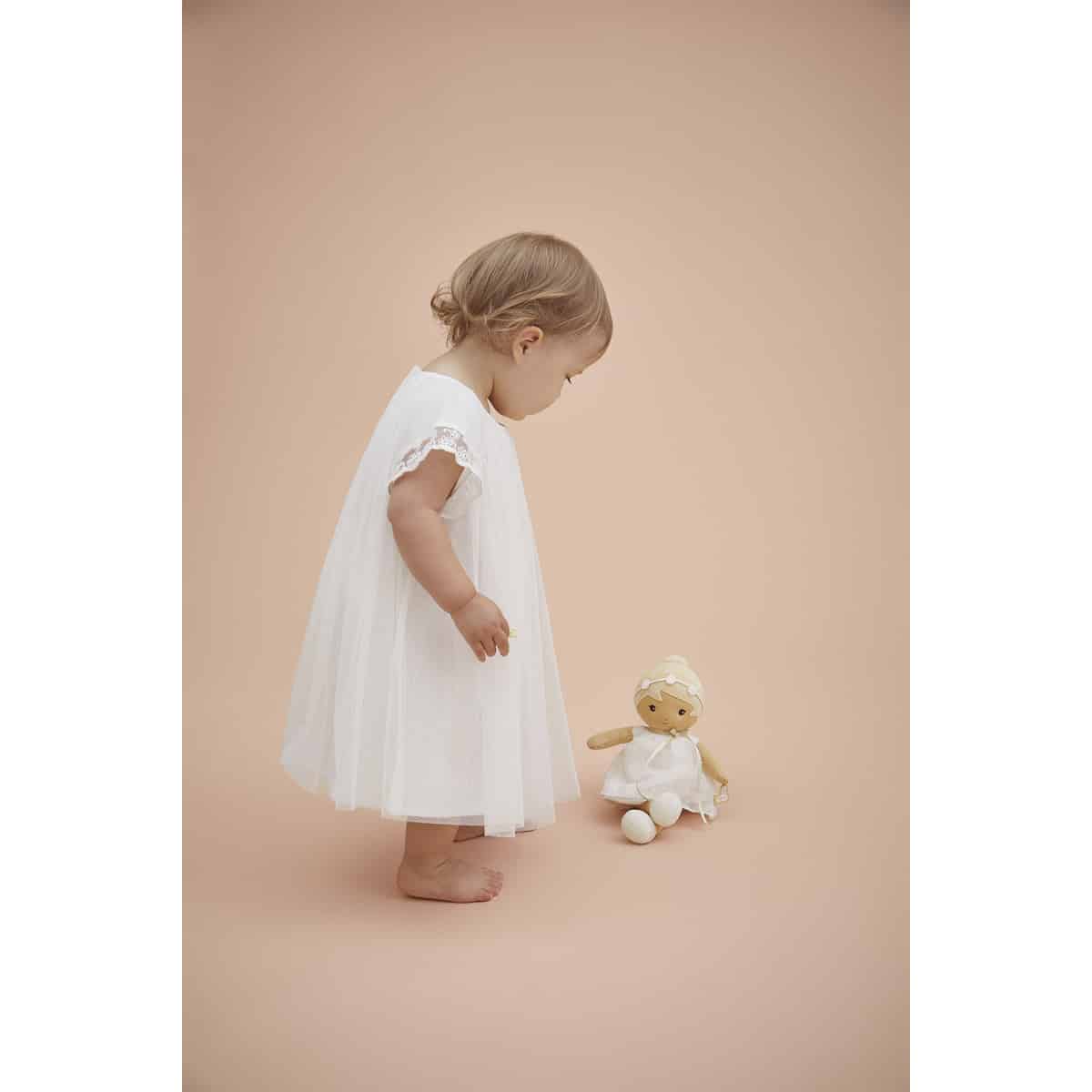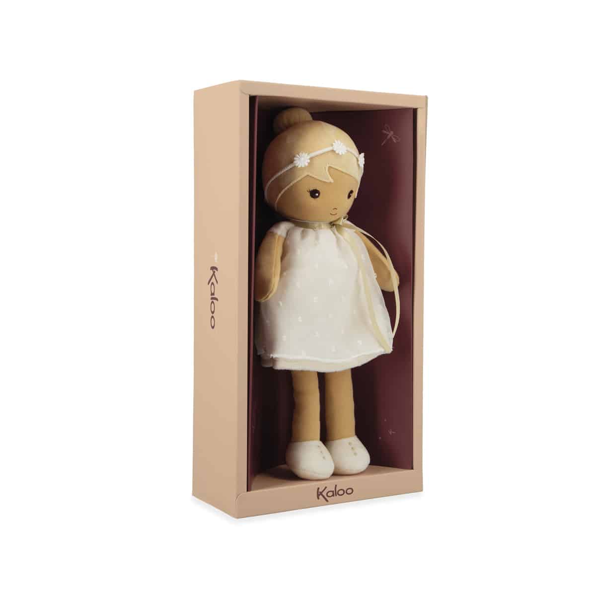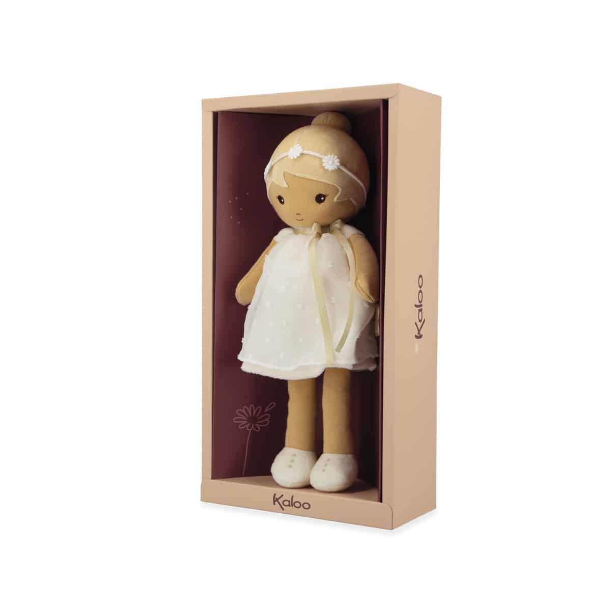 Deze charmante stoffen pop uit de Tendresse-collectie van Kaloo is geschikt vanaf de geboorte. Daphne draagt een prachtige witte jurk die haar lieve persoonlijkheid en tijdloze elegantie weerspiegelt. Met haar bijpassende bloemenhoofdband en schattige laarsjes is ze altijd klaar voor dromerige avonturen, of ze nu door denkbeeldige tuinen wandelt of meedoet aan alledaagse spelletjes. Daphne heeft een persoonlijk tintje: een lintje op haar rug waar je de naam van je kindje op kunt schrijven – perfect om haar echt uniek te maken. Ze wordt geleverd in een mooie geschenkdoos en is een attent kraamcadeau of cadeau voor een pasgeborene. Het is bovendien een ideale eerste pop om de fantasie en verzorgende speelstijl te stimuleren.