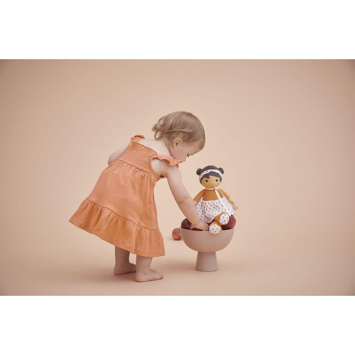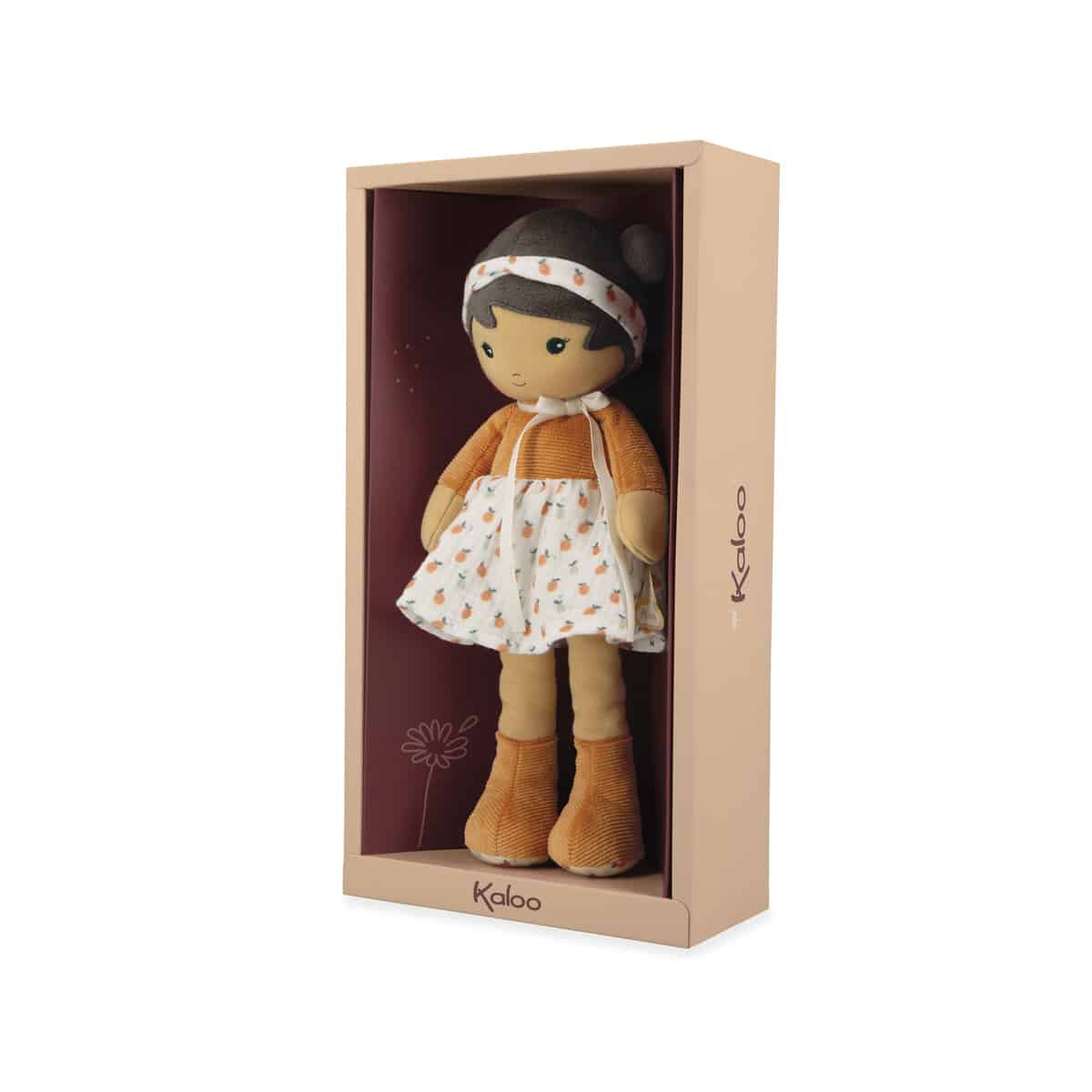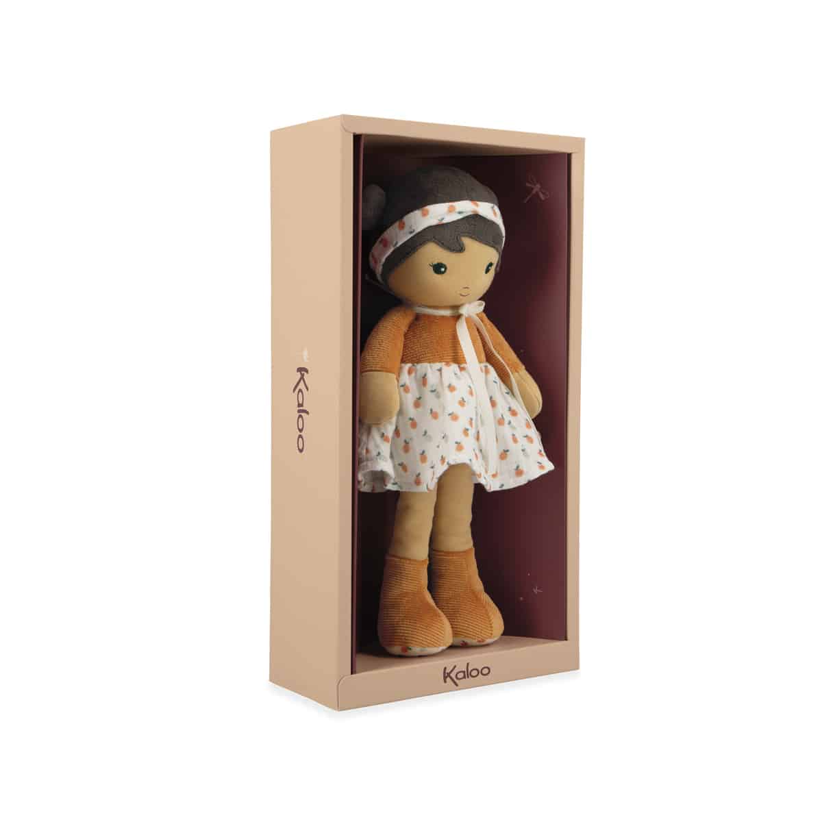 Maak kennis met Eloise, een charmante stoffen pop van 32 cm. Ze draagt een elegant topje, terwijl haar laarsjes zorgen voor comfort en een rustieke uitstraling. Haar rokje heeft een fruitprint, die de zachtheid van de zomer en zonnig fruitplukken oproept. Een delicate haarband die haar speelse dubbele knotjes accentueert, past perfect bij haar rokje. Eloise belichaamt de zoetheid van dagen op het platteland, gevuld met landelijke wandelingen en dagdromen onder appelbomen. Aan een mooi lintje op haar rug kun je de naam van de baby schrijven. Het royale formaat van deze pop garandeert heel wat knuffelmomenten. Eloise’s jurk is gemaakt van corduroy en chiffon. Ze is machinewasbaar op 30°C. Minimaal 80% gerecycled vulmateriaal. Geschikt vanaf de geboorte.