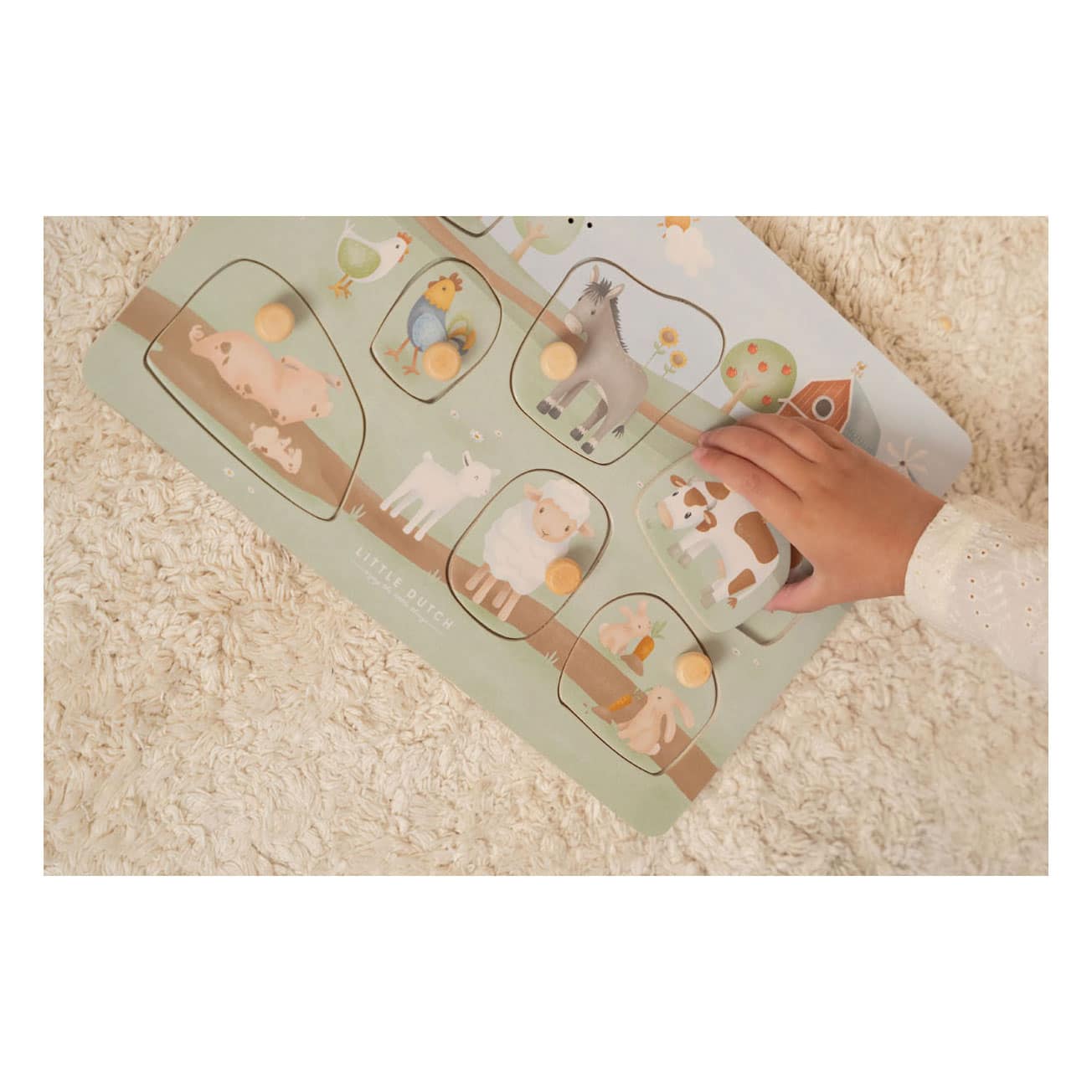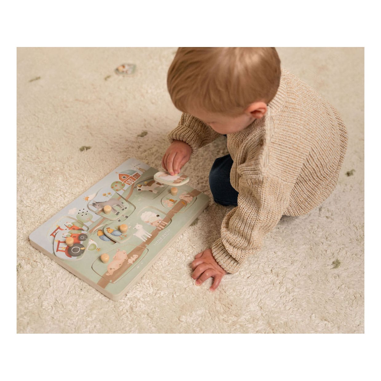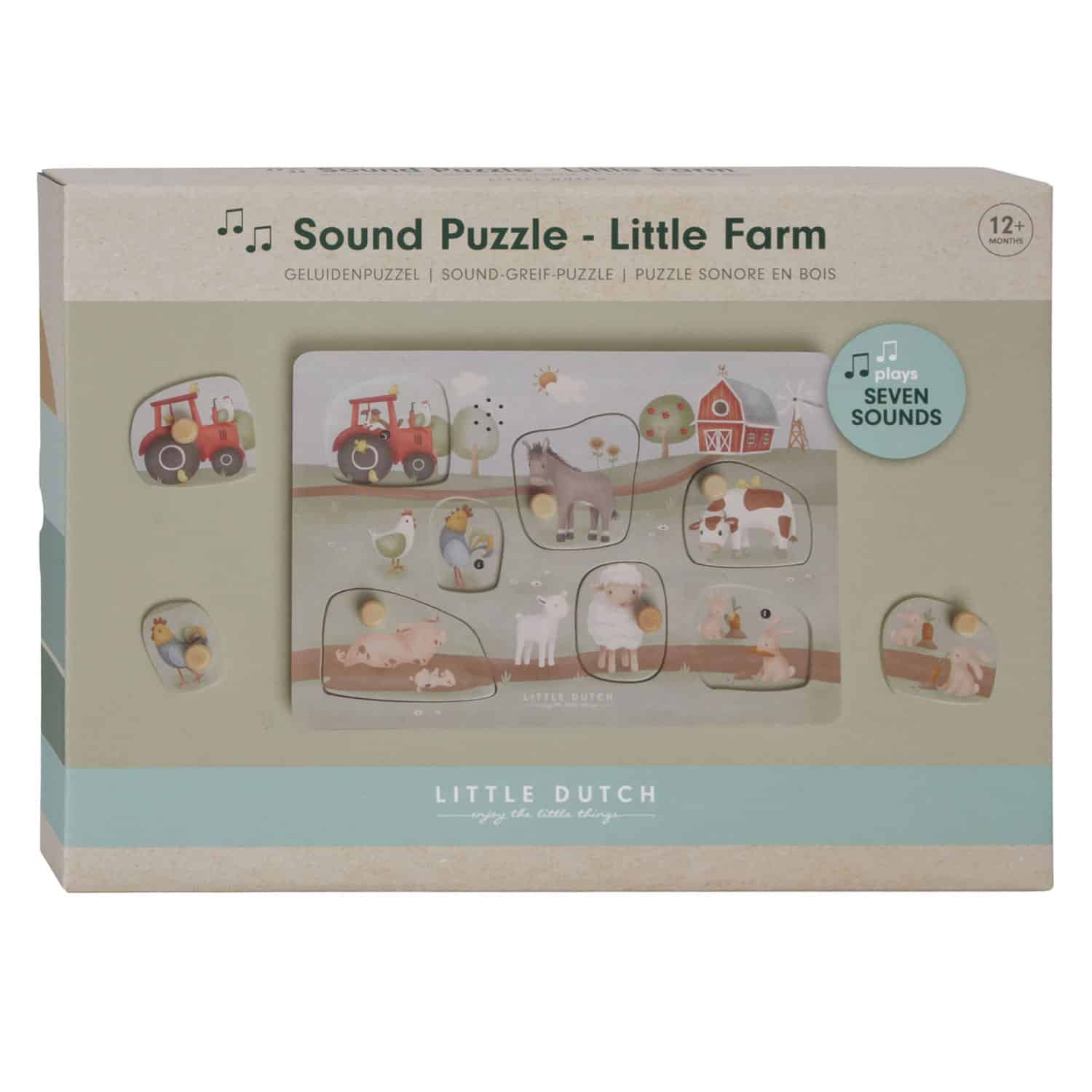 Maak kennis met alle diertjes op de boerderij. Herken hun vormen en unieke geluiden met deze leuke puzzel. Als je het diertje terugplaatst op het juiste plekje hoor je een bijpassend geluidje. Deze puzzel met 7 diertjes en een tractor met geluiden bevordert de oog- hand coördinatie en stimuleert de woordenschat van je kindje. De sensoren reageren wanneer het puzzelstukje wordt teruggeplaatst. Puzzel bevat door licht geactiveerde sensoren – gebruik bij fel licht voor de beste resultaten. Zorg ervoor dat de schakelaar op AAN staat om de geluidsfunctie in te schakelen. Sensoren kunnen per ongeluk worden geactiveerd door direct zonlicht, dus schakel ze altijd uit als er niet mee wordt gespeeld. (Batterijen (2 x AAA) niet inbegrepen.)