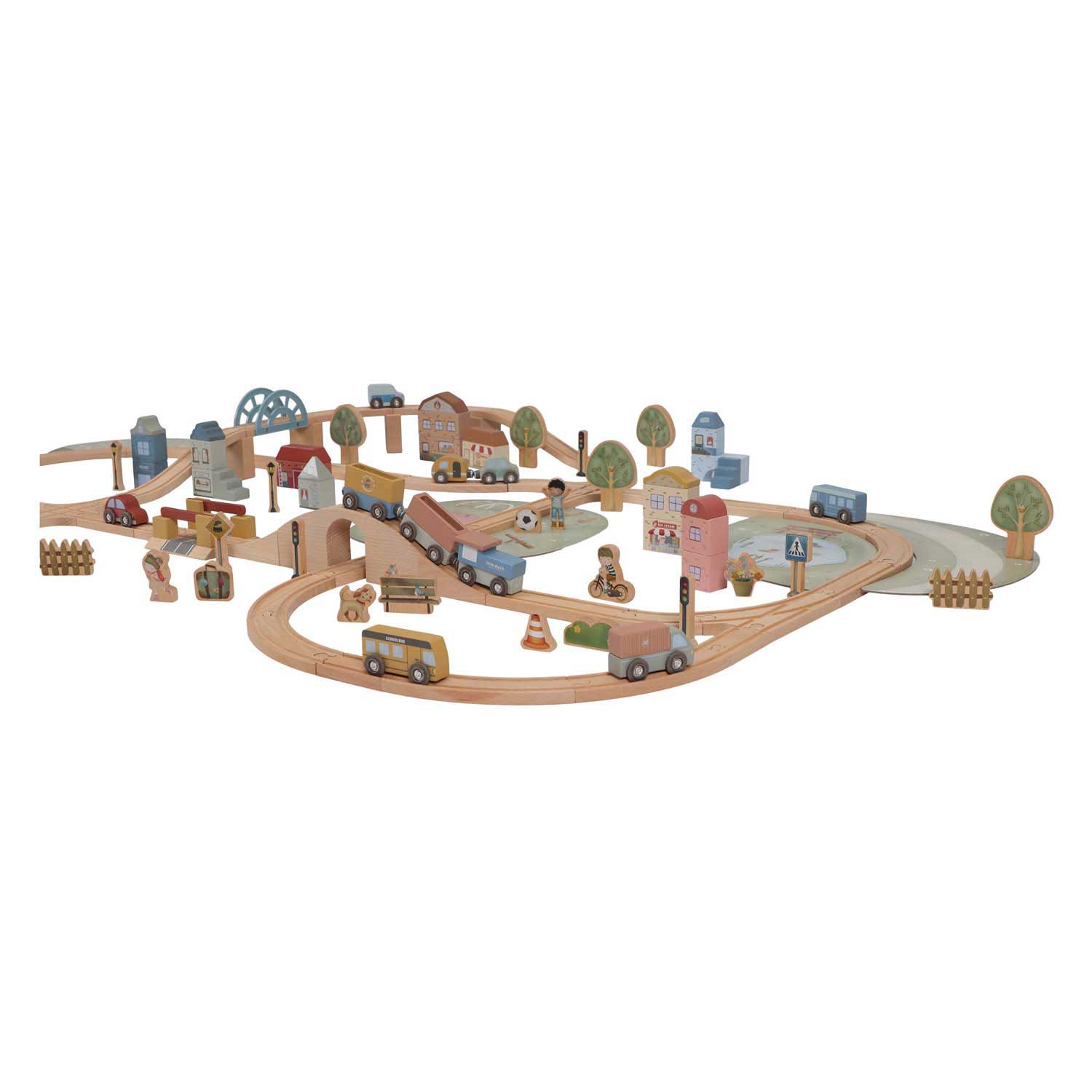 Bouw je eigen wereld met de Little Dutchwooden XL treinset! Deze uitgebreide set bevat een locomotief, wagons, fracks, bruggen, gebouwen, auto’s en figuren. Er zijn ook bomen en verkeersborden! De mogelijkheden zijn eindeloos. Rij met de trein over de brug, stop bij het station en verken de stad. Combineer de XL treinset met uitbreidingssets om speeltijd nog leuker te maken. Ben je klaar om in te stappen? .