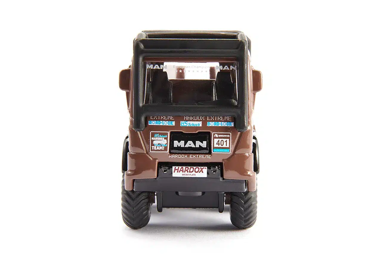 De toegang is extreem stijl. De banden met grof profiel kunnen ondanks terreinondersteuning en vierwielaandrijving bijna geen grip krijgen. Gelukt, nu gaar het verder over de rotsblokken. Wat voor een vrachtwagenchauffeur onvoorstelbaar is, is in de Truck -Trial een bijzondere uitdaging en een sensationeel gevoel voor zowel de chauffeur als het publiek. De HS Schoch 8×8 MAN Truck-Trial is ontwikkeld en geconstrueerd voor wedstrijden in extreem zwaar terrein. Het voertuig van de achtvoudig Europees kampioen in Truck-Trial is versierd met de originele sponsorstickers en voorzien van een uitwendige rolbeugel. Met de twee meegeleverde borden kan de kinderkamer worden veranderd in een trial-parcours.