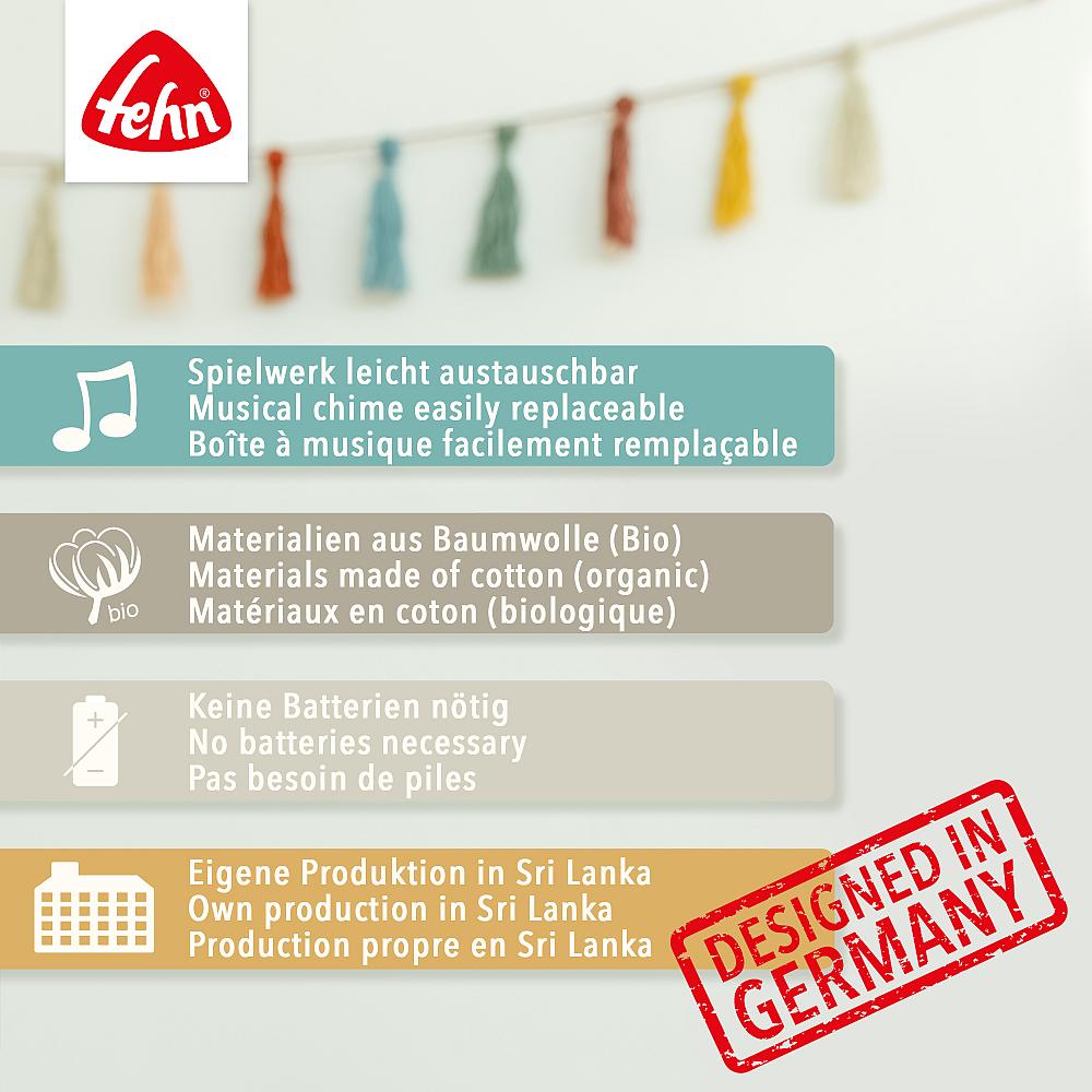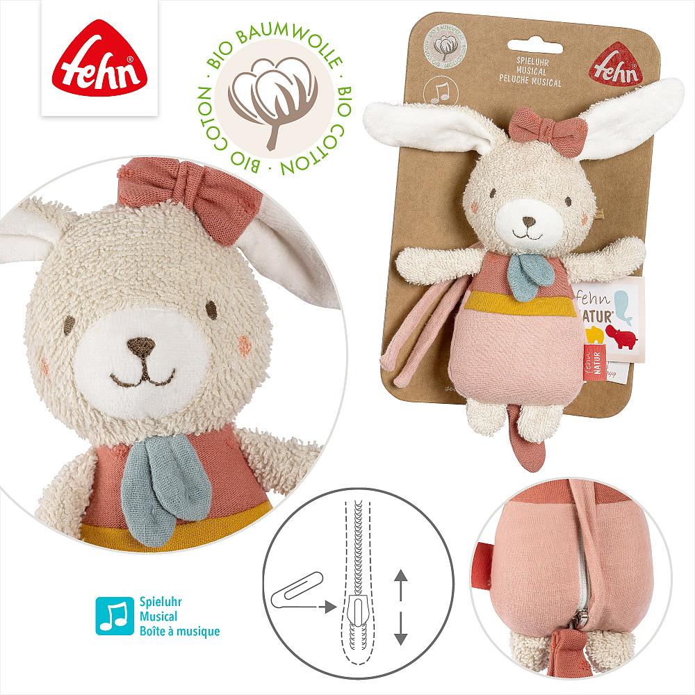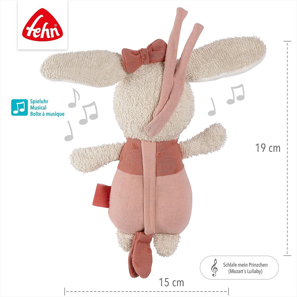 Knuffel en slaaphulp van biologisch katoen de melodie “Mozarts slaapliedje” kalmeert in elke situatie, voor thuis en onderweg, voor baby’s en peuters. Het kleine haasje verovert direct het hart van de baby: het nodigt uit tot knuffelen, de melodie van Mozarts Wiegenlied troost en wiegt zachtjes in slaap. ZACHTE MELODIE – Wanneer het muziekmechanisme wordt opgewonden, klinkt het geliefde slaapliedje/de melodie op een aangenaam volume, waardoor kleine dromers zachtjes in slaap vallen. Kan gemakkelijk aan het ledikantje, de kinderwagen of het autostoeltje worden bevestigd – een ideale metgezel! De buitenmaterialen badstof, jersey, mousseline en velours, en de vulling van organische materialen nodigen uit tot knuffelen, vastpakken en spelen.