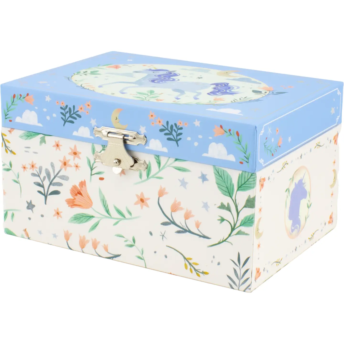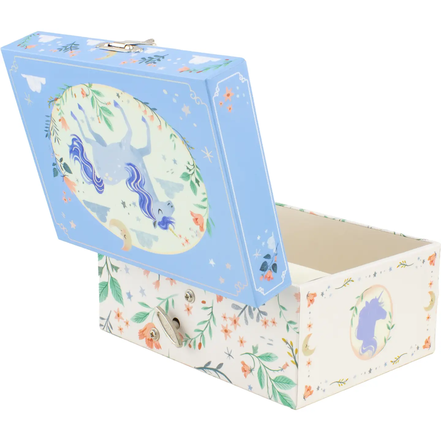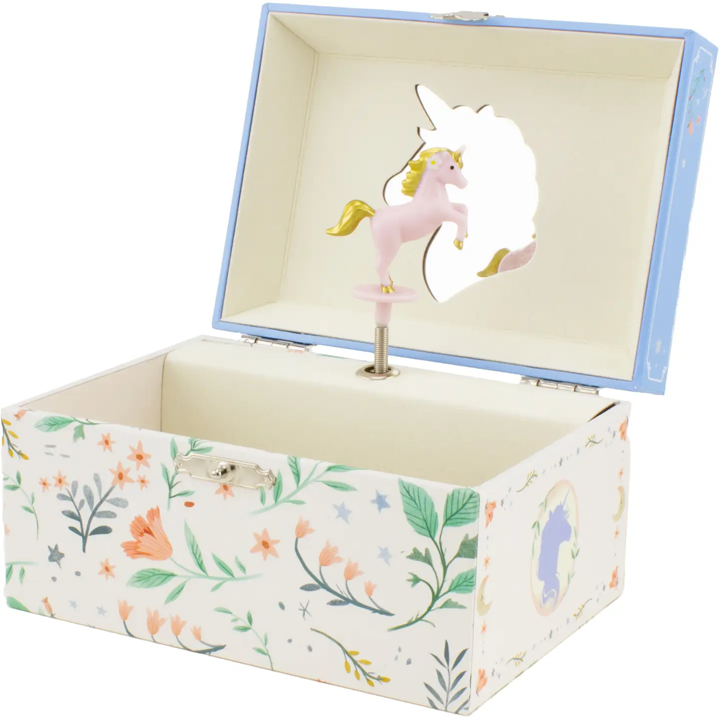 Muzikale juwelendoos met betoverend design. Handmechanisme met sleutel die aan de achterkant kan worden opgerold. Muzikaal thema: „The Unicorn” van Lalo Schifrin Bij de opening draait een eenhoorn in harmonie met de muziek. Spiegel in de vorm van een eenhoornkop voor een vleugje magie. Milieuvriendelijke verpakking gemaakt van kraftkarton, zonder plastic