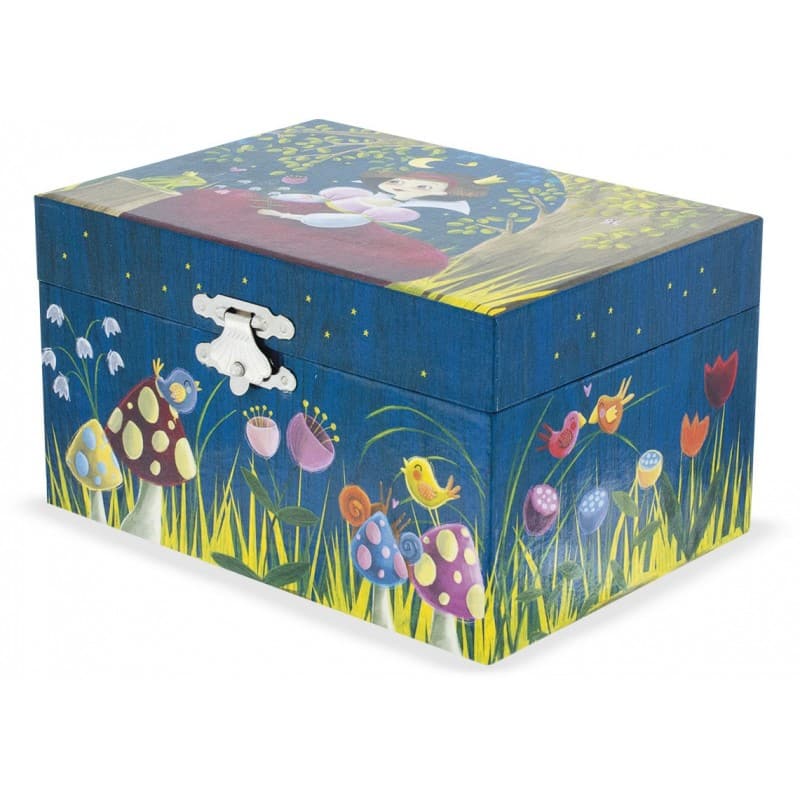 Melodie: Legendes van het Weense Woud (Ödön von Horváth). Rechthoekige muziekdoos met handmatig opwindmechanisme op de achterkant van de borst. Deze muzikale kist is versierd met een illustratie van een prinses en haar kikker. Wanneer het opengaat, komt een poppetje tot leven en draait het om het geluid van delicate muziek. © Design Claire Gaudriot.