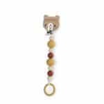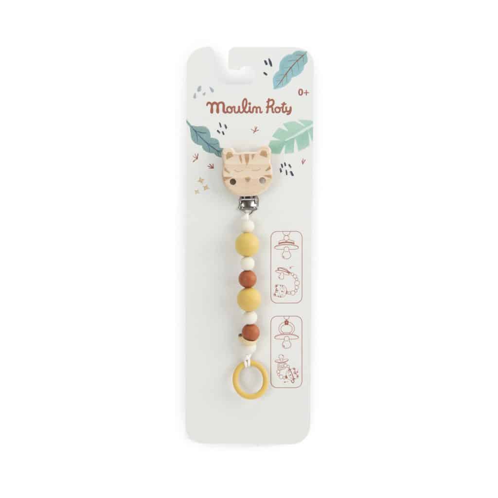 Houten en siliconen tijgervormige speenclip om de speen van je baby veilig en stevig op te bergen. Dankzij de verstelbare clip kun je hem aan elk oppervlak bevestigen. De siliconen kralen zijn veilig voor kinderen om mee te spelen en op te kauwen. Afwasbaar met een zachte, vochtige doek.