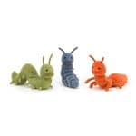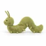 Wiebelt om hallo te zeggen: het is Wriggidig Caterpillar! Deze tuinvriend is evenwichtig en zacht en heeft een pluizige mosgroene vacht. Hij heeft suède benen en antenne, en je kunt hem in de aarde spelend vinden.